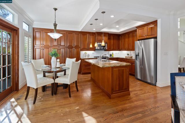 Move-in ready light-filled home on cul-de-sac w/no bkyd neighbors & inviting pvt bkyd w/views. Located in San Ramon’s exclusive The Lake at Canyon Lakes, a 24/7 staffed gated San Ramon community nestled along the Canyon Lakes 18-hole golf course surrounded by resort-style amenities, pools, clubhouse, tennis/pickleball cts, miles of walking paths. 2044+/-SF. 3 bds. 2.5 bths. Hardwd flrs, vaulted ceilings, plantation shutters, transoms, crown & chair rail molding, recessed lighting, fresh int. paint. Formal living rm w/wet bar, cabinets & wine frig. Formal dining area. Spacious fam rm w/gas frpl. Chef’s kitchen w/granite counters, island/bkfst bar, pendant lighting, cherry cabinetry, KitchenAid range, dishwasher, microwave. French dr. refrigerator. Casual dining area w/wall of cabinets. French drs open Trex decks, gardens, spacious venues to entertain & relax. Bdrms on upper flr. Primary retreat w/vaulted ceiling, views. En suite w/walk-in closet & built-ins, dual-sink vanity, updated fixtures, jetted tub, shwr. 2 bdrms share Jack & Jill bthrm w/dual-sink vanity, tub/shwr combo. 2-car garage. Laundry rm. Newer fencing. Nest thermostats. 2 mi to Crow Canyon Commons Shopping Ctr, Iron Horse Trail, freeway. Near top-rated SRVUSD schls, parks, yr-round farmers market at City Center.