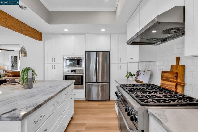 Beautifully updated and well maintained single story home in sought after Turtle Creek. Wonderful open floorplan with 3 bedrooms & 2 bathrooms, living room with gas fireplace and built in storage. Large dining room area. Stunning light filled updated kitchen w/ floor to ceiling white cabinets, quartzite slab counters, designer backsplash, upscale stainless steel appliances w/ gas stove, 2 ovens, microwave. Large island with bar for informal meals or perfect for gatherings. Slider off kitchen area opens to yard with large covered patio, perfect for alfresco dining. Lawn area for play, sports court w/built in basketball hoop & dog run. This is truly an entertainers delight. Backs to open space for privacy and views of the rolling hills. Primary bedroom with dual closets & slider to yard. Primary bath has dual sinks and spa like soaking tub. Home has recessed lighting, recently painted, newly installed flooring & contemporary baseboards. Tons of attic storage in the home and in the 2 car garage. Community has tennis & basketball courts, playground, greenbelts & trails. Close to Newhall park w/dog parks, Bocce & playfields. Close to shopping, restaurants, daycare, commuter routes & schools. Open house Sat & Sun 12/ 6 & 7 1-4. Offers due 12/9 @ 3pm