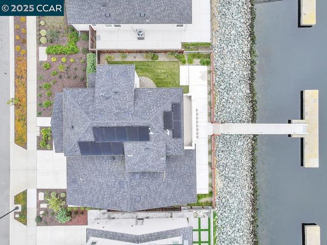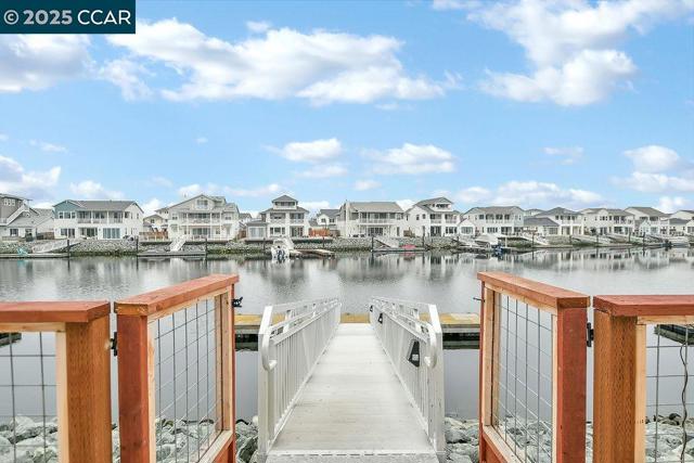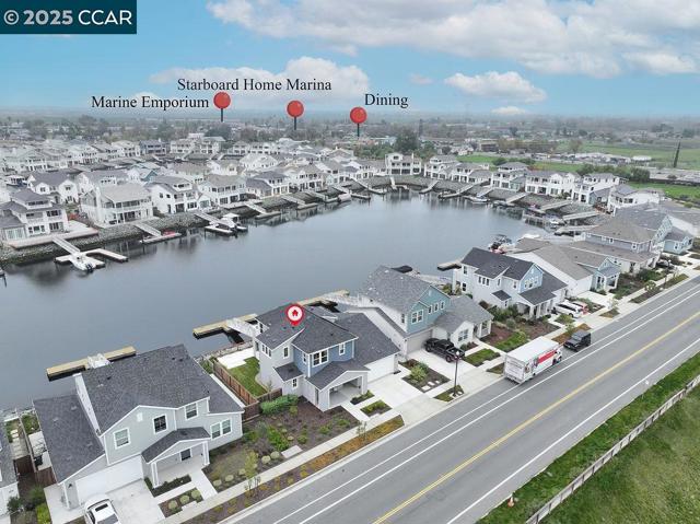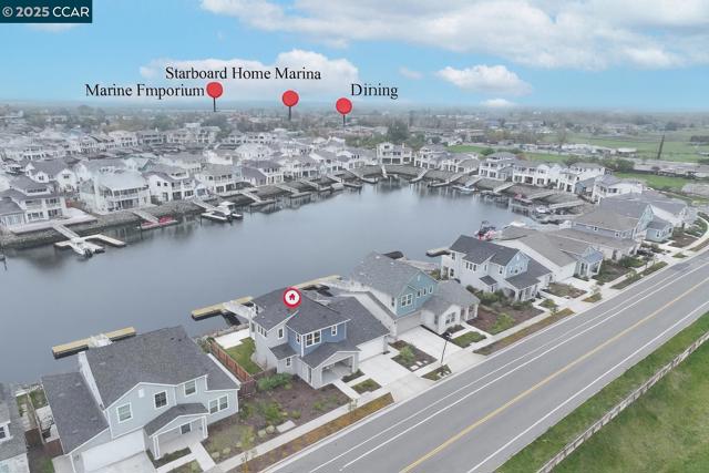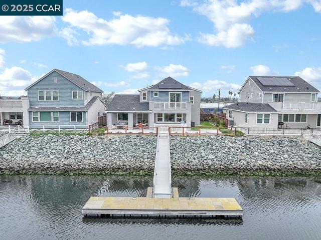 Waterfront Luxury with Private Dock — 2022 Build in Delta Coves. This Beautiful two level 3 Bedroom 3 Bath waterfront home is in the coveted Delta Coves community, featuring Ivy Point white oak flooring and an open, sun-filled main level designed for effortless indoor/outdoor living. The kitchen offers generous counter space, a walk-in pantry, and clear sightlines to the water. Upstairs, the primary suite includes a private deck with panoramic views of the lagoon and Mt. Diablo, dual his-and-hers vanities, a walk-in closet, and a spa-inspired bath with soaking tub. A modern office (optional 3rd bedroom), a spacious secondary bedroom, and 3 full bathrooms offer flexibility for work, guests, or family. The 3-car tandem garage provides ample storage or the opportunity to expand the living area and maximize waterfront views. The fully landscaped backyard features an outdoor kitchen with a 16-foot bar, full-size grill, sink, fridge, storage, & a built-in pizza oven. ($100K worth of upgrades) Private dock offers fast-water access for boating, paddleboarding, and sunset cruising. This home delivers the best of California indoor/outdoor living on the water. Including access to the private Delta Coves Island Camp—a vibrant 15,000-square-foot hub of activities for families and friends.