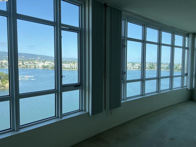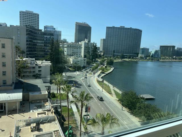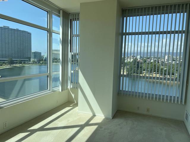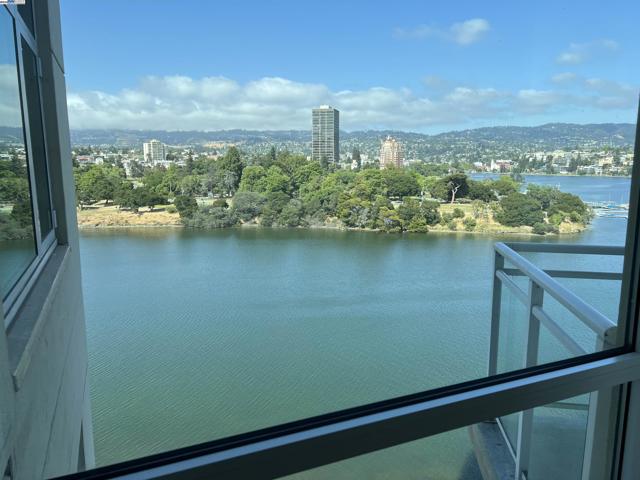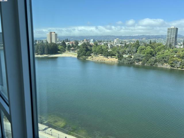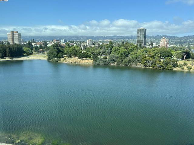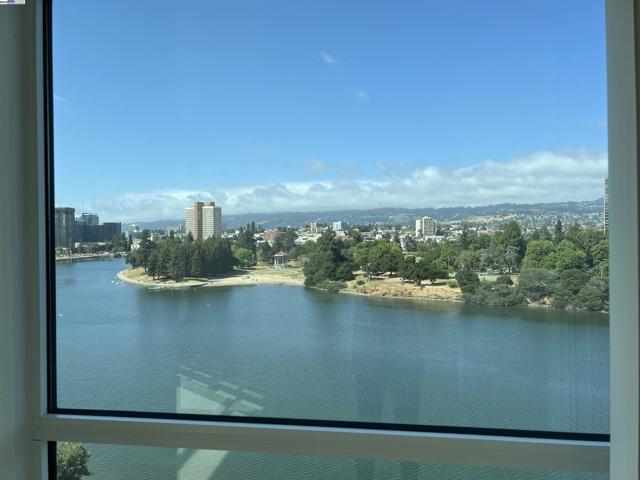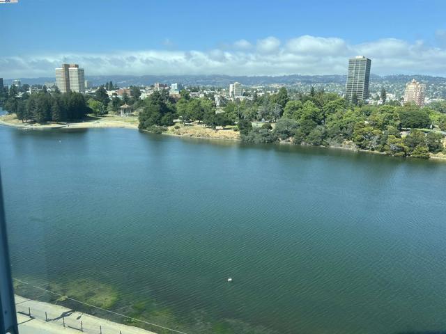 Spacious corner unit with 270° lake and city views! This rare 2-bedroom, 2-bath condo at The Essex offers 1,349 sq ft of elevated living with breathtaking views of Lake Merritt, the Oakland skyline, and hills from every room—including a large bonus area ideal for dining, a home office, or reading nook. This light-filled home features plush carpet flooring, 9-foot ceilings, expansive windows, and an open-concept great room and kitchen. The kitchen is equipped with newer appliances, including a stove, dishwasher, refrigerator, microwave oven, and heaters for year-round comfort. The spacious primary suite includes a walk-in closet and a luxurious bathroom with a view. Enjoy 2 indoor parking spaces and access to resort-style amenities: lap pool, spa, fitness center, business center, clubhouse, and 24-hour concierge/security. Just steps from Lake Merritt and close to BART, Grand Lake, Uptown, and Downtown dining and shopping.
