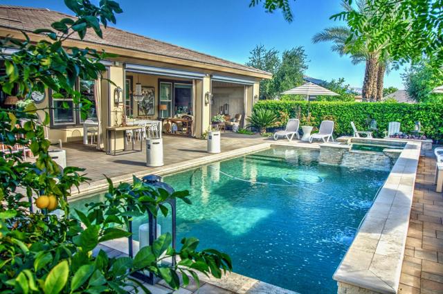 A one-of-a-kind designer dream home with custom detail throughout the home! This home is in the ''all ages'' section of the community that's a short distance from the clubhouse and community amenities. The Celebrare Model has 2451SF with open concept living spaces that includes a chef inspired kitchen with GE Cafe/Monogram appliances, upgraded cabinets, oversized custom quartz island and butler's pantry adjacent to the kitchen. The dining area features custom cabinetry and 2 wine refrigerators. The lounge area features a contemporary gas fireplace. The office features custom shelving. The side wall in office stores an automatic full-size bed. Bedrooms and bathrooms with custom upgrades. Other enhancements include custom millwork around all doorways and windows, recessed lighting, ceiling fans, and custom window treatments. Patio, rear and side yard through 2 large rolling walls of glass. The backyard amenities feature private pool/spa, firepit, expanded covered patio, outdoor kitchen complete with grill, pizza oven, bar furniture, fireplace and more. Private entry courtyard with firepit, fountains and pergola. The garage includes epoxy floors and mini split AC. Optional club membership transfer fee = $1,875 (vs. $12,500 if not a member). Club amenities include tennis/pickleball courts, fitness center, resort/lap/fitness pools & spa, poker/billiards room & artisan studio. Community also features putting green, bocce ball court, large chess game area, and walking trails.