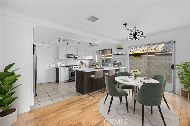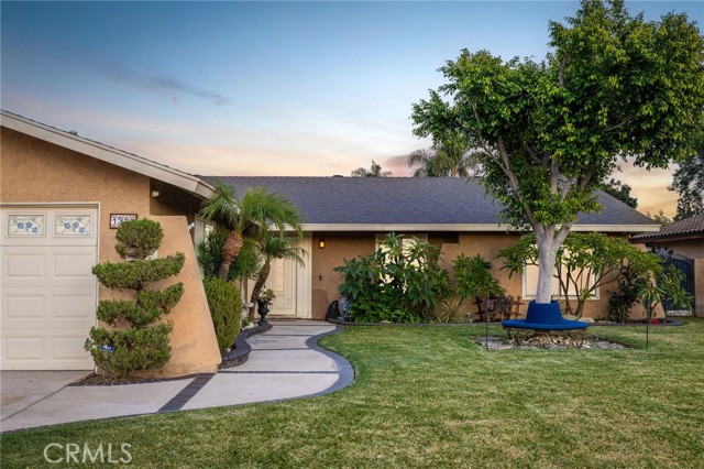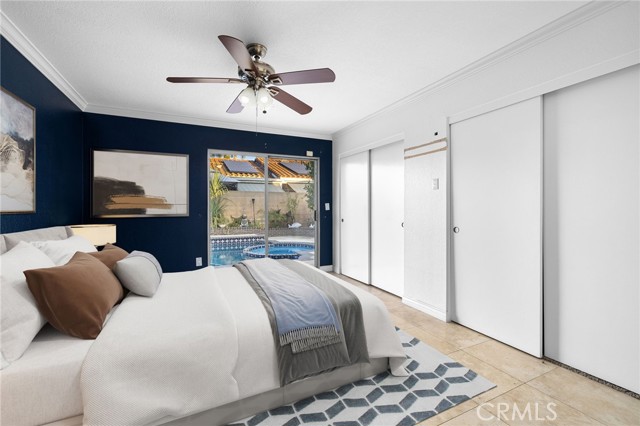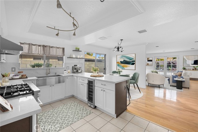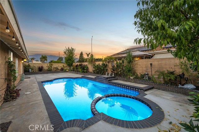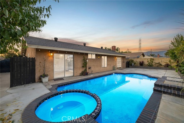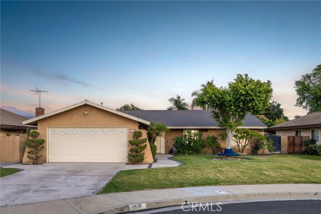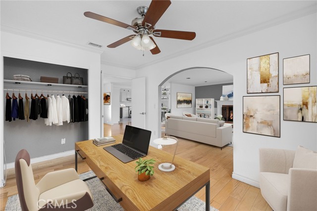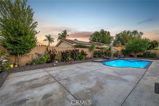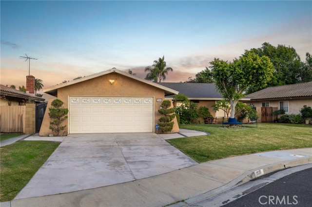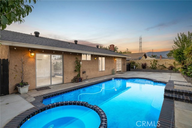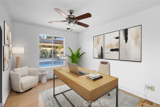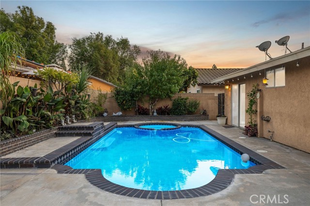 Remodeled Pool Home on a Private Cul-De-Sac. A manicured front yard with a lawn, clean planters, and a concrete walkway leads to a welcoming covered porch. Inside, the open-concept layout features rich wood flooring, crown molding, and recessed lighting throughout. The remodeled kitchen offers white shaker cabinetry, quartz counters, stainless steel appliances, including a sleek slimline wine fridge, a farm sink, and a peninsula with bar seating. An adjacent dining area provides abundant natural light and direct access to the side yard through a sliding glass door. The spacious family room showcases a brick fireplace with a raised hearth and mantel, recessed lighting, and French doors framing views of the pool and backyard. Just off the family room is an office with an arched opening and double-door hallway access (previously the fourth bedroom and easily convertible back if desired.) Down the hallway, the primary bedroom overlooks the pool and features tiled flooring, crown molding, a ceiling fan, dual closets, and a sliding door to the backyard. The primary bath includes a walk-in shower with a glass enclosure and a pedestal sink. Two additional bedrooms also offer ceiling fans and share a well-appointed hall bath with a tub/shower combo and pedestal sink. The backyard is designed for entertaining, offering a sparkling pool and spa, expansive concrete decking, elevated brick planters, and block walls on all sides for privacy.
