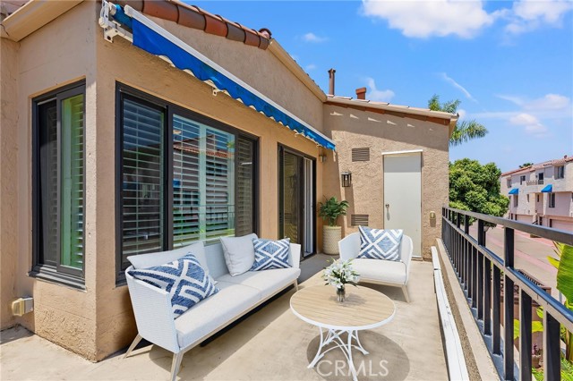 Harbor Views • Coastal Lifestyle • Top-Floor Corner Unit Situated in the coveted, guard-gated Broadmoor community, this top-floor corner unit offers peekaboo views of the harbor and a rare blend of privacy, style, and location. Just steps from the beach, this home invites you to enjoy resort-style living with unmatched convenience. The remodeled kitchen features black granite countertops, sleek matching appliances, and a built-in wine fridge — with the washer, and dryer included. Vaulted ceilings and a gas fireplace create a warm, open living space, where mirrored walls reflect natural light and stunning harbor views. The spacious wrap-around balcony is ideal for relaxing or entertaining. Retreat to the primary suite featuring dual stone sinks, a spa-style river rock shower, and a versatile loft perfect for an office or lounge. Additional highlights include plantation shutters, recessed lighting, ductless A/C, ceiling fans, and a finished two-car garage with built-in storage. Broadmoor offers resort amenities including a heated pool, spa, three tennis courts, and private paddleboard launch access. Walk to top restaurants, Mother's Market, Starbucks, and more — all just across from PCH.