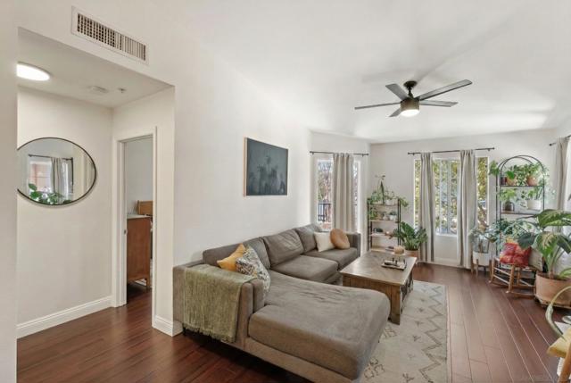 Stunning , sunny premier location, upper-level home welcomes you the moment you step through the door! Nestled in the highly sought-after gated community of Vista Del Lago, this beautifully/recently upgraded and meticulously maintained unit lives bigger than its size with the airy, vaulted ceilings and open space views! Dark Bamboo wood floors flow through the living room, dining area, hallway, & primary bedroom, complementing the custom-designed kitchen featuring new modern flooring and quartz counters, stainless steel sink and appliances. Unique to this unit is the large entry closet and additionally, a pull-down attic offers even more space for storing larger items. Primary walk-in closet has also been extended. Take in lush views from the private balcony. Assigned covered carport is directly in front. This home is a true gem! Schedule a tour today before someone else gets this beautiful move in ready home! Complex now approved for Fanny Mae and conventional lending. Come check out the Bernardo Vista Del Lago resort lifestyle complete with 2 community hot tubs, 3 pools (including 25-meter exercise lap pool), fully equipped exercise gym, pickleball, tennis, recreation room, duck pond and scenic hiking and biking trails. When you're done enjoying all of the community amenities, . Plenty of guest parking spots , as well as EV charging stations for convenience.