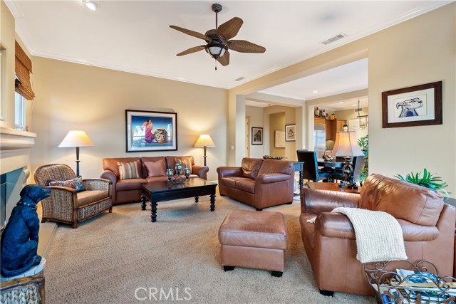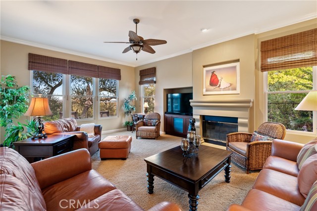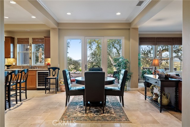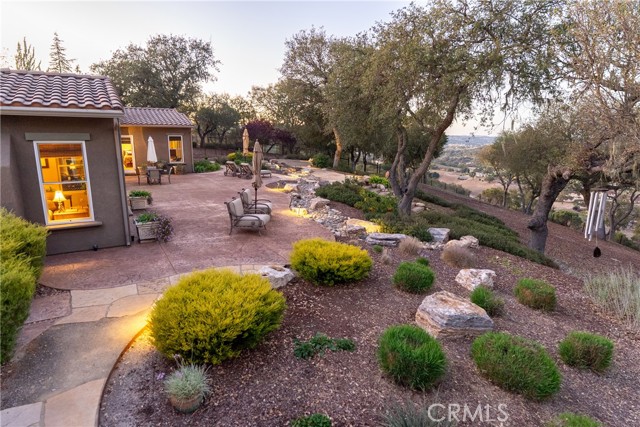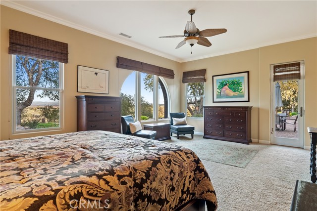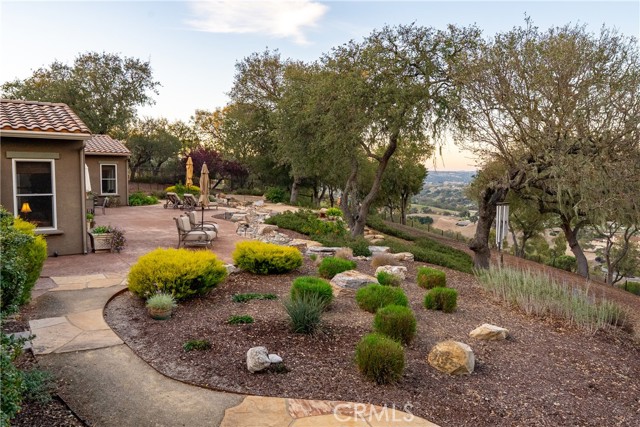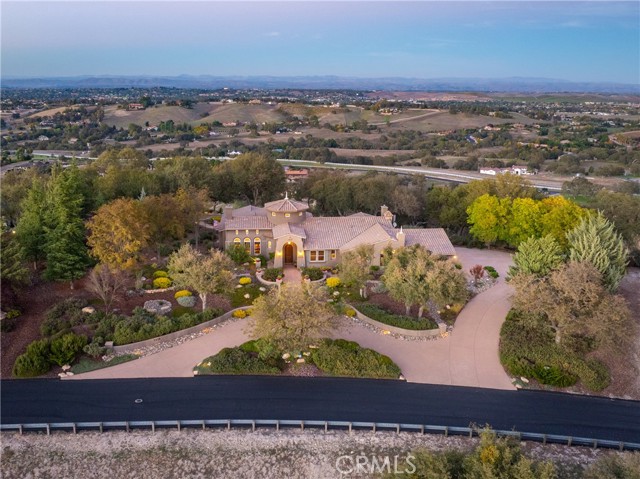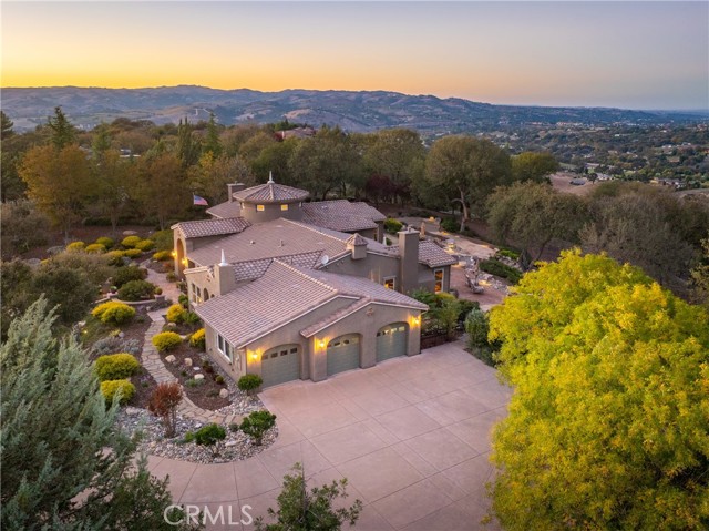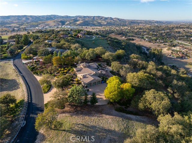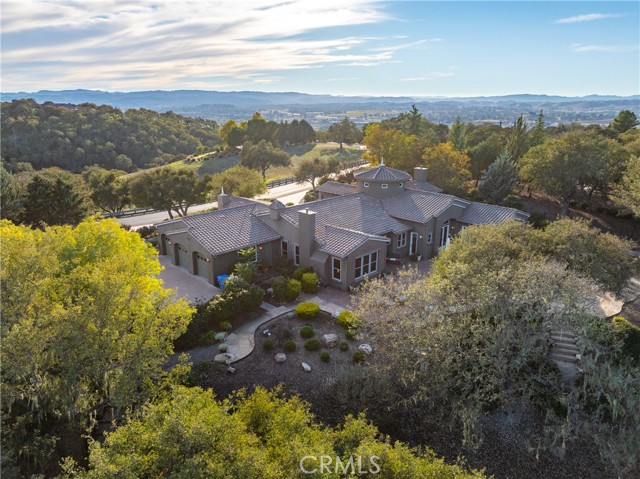 Experience refined Central Coast living in this stunning 4,146± sq. ft. Spanish Colonial estate, perfectly positioned on a private 3± acre parcel within the exclusive gates of Santa Ysabel Ranch. Enjoy sweeping 180° views of vineyards and mountains from nearly every room. This 4-bedroom, 3.5-bath home welcomes you through a grand rotunda entry with soaring ceilings, custom lighting, and travertine flooring throughout. The formal living and dining rooms feature tall Anderson windows framing breathtaking vistas and a cozy gas fireplace. The gourmet kitchen is equipped with GE Monogram stainless appliances, including a six-burner range, double ovens, wine fridge, and granite countertops with maple cabinetry. The adjoining family room and casual dining area create an inviting space for entertaining with seamless indoor-outdoor flow. The spacious primary suite offers privacy, dual walk-in closets, and a luxurious bath with soaking tub and large shower. Additional bedrooms and a flexible office space capture beautiful hillside and sunset views. Outdoor living shines with expansive flagstone patios, multiple sitting areas, and lush landscaping surrounded by heritage oaks - perfect for dining, relaxing, or entertaining under the stars. Additional features include an epoxy-finished 3-car garage with custom cabinetry, Culligan water system, ADT security, and custom lighting throughout. Santa Ysabel Ranch offers 24/7 gated security, walking trails, tennis courts, and a serene lake setting - an unparalleled blend of luxury, privacy, and natural beauty.