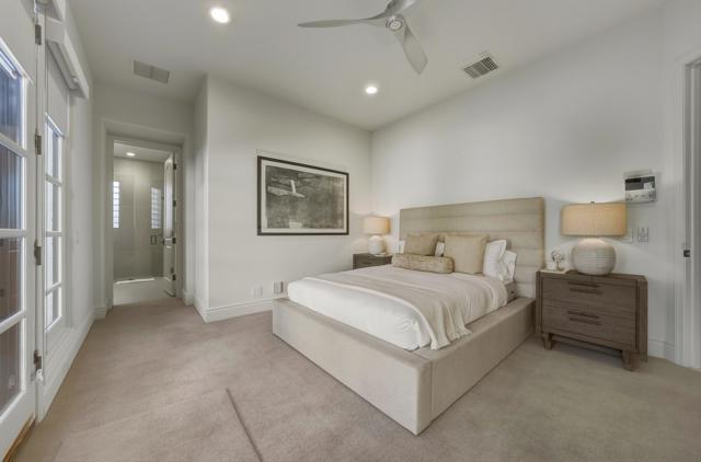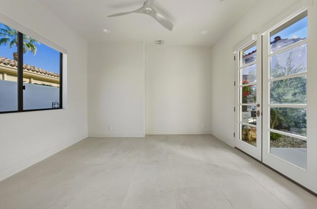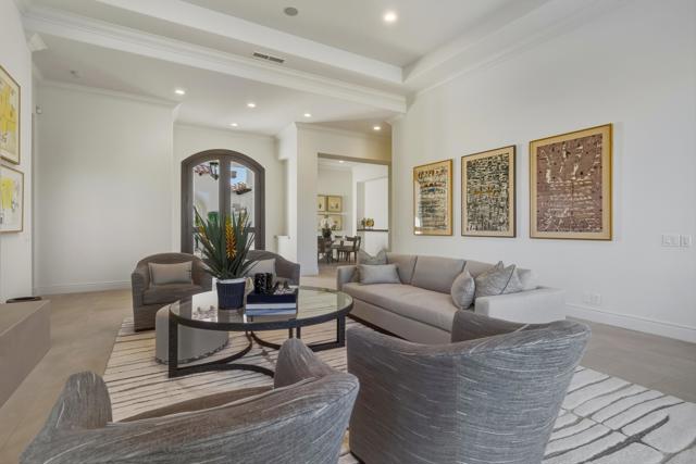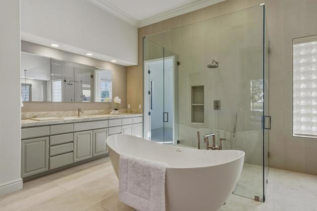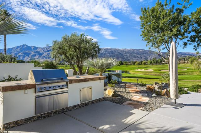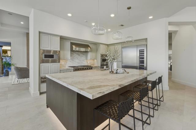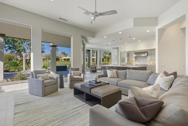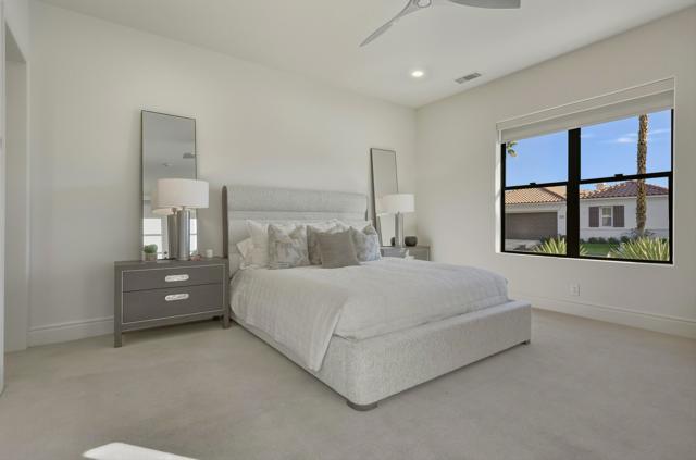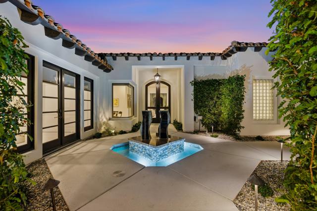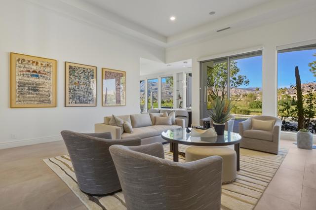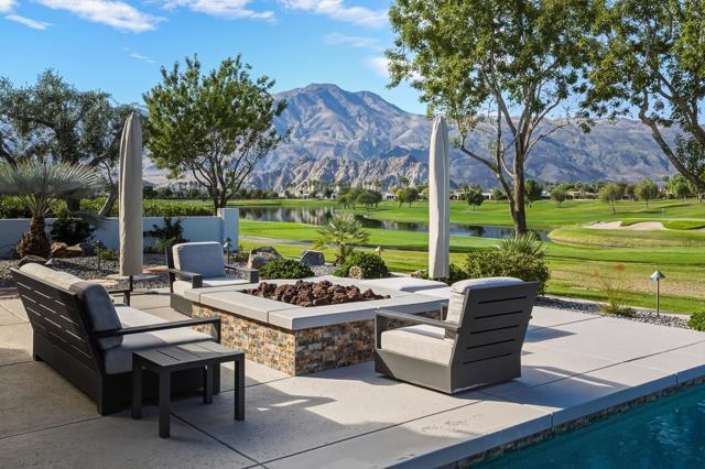 Welcome to a newly reimagined residence in the prestigious PGA West Summit Estates, perfectly positioned to capture Iconic Amen Corner views--the legendary vantage point overlooking the triple fairway, shimmering lake, and dramatic southwestern mountain backdrop. This semi-custom estate has undergone an extensive, top-to-bottom luxury renovation, elevating every space with refined materials, designer finishes, and a fresh contemporary aesthetic.From the moment you step into the private gated courtyard, the home reveals an atmosphere of modern serenity. Inside, soaring ceilings, expansive walls of glass, and elegant architectural lines frame panoramic fairway and mountain vistas, creating a seamless connection between the interior and the stunning outdoor setting.The full interior remodel showcases a sophisticated palette and exceptional craftsmanship throughout. Upgrades include all-new interior paint, beautifully updated flooring, new bathroom designs with premium plumbing fixtures, sinks, toilets, lighting, illuminated mirrors, custom glass shower enclosures, and a luxurious freestanding soaking tub in the spa-inspired primary bath. The kitchen and bar areas shine with Taj Mahal slab countertops, new refrigeration systems (kitchen fridge, wine cooler, and bar fridge), a new microwave, and a completely redesigned island with striking modern lines.Both the family room and primary suite now feature custom-built entertainment centers, complementing the home's sleek new lighting, recessed LED can fixtures, and contemporary ceiling fans. Additional enhancements include new carpet in all bedrooms, updated window shades throughout (both motorized and manual), and thoughtfully upgraded Moen water-leak detection for peace of mind.The living room centers around a magnificent Creme de Provence limestone fireplace surround, a sculptural focal point that elevates the entire space. A newly redesigned bar adds sophistication and convenience for entertaining, while new AV systems, professional Ring cameras, and a fully monitored security system provide modern functionality and security.Outdoors, the transformation continues with new pool and fountain equipment and beautifully refreshed exterior landscaping featuring new plantings and rock accents.