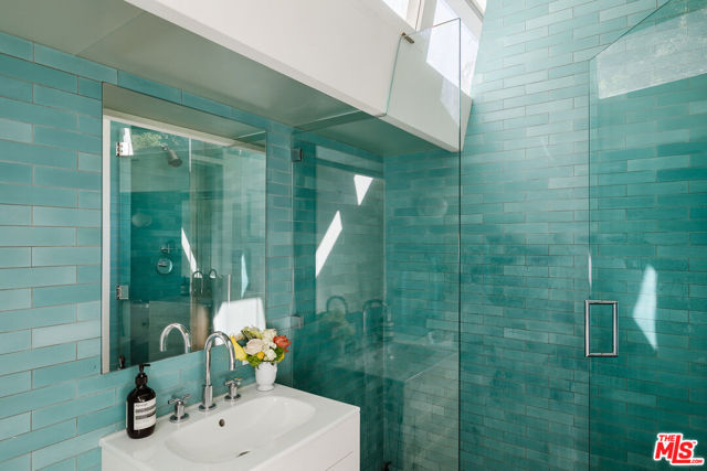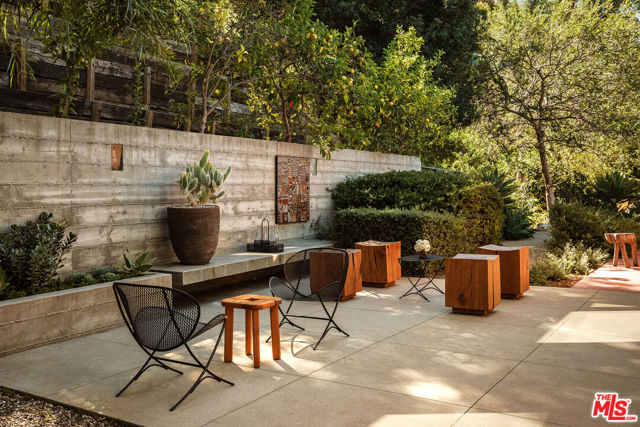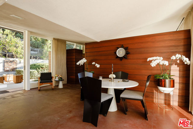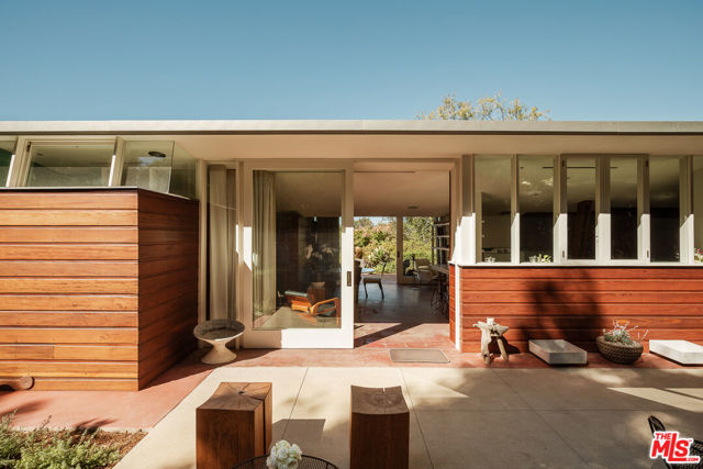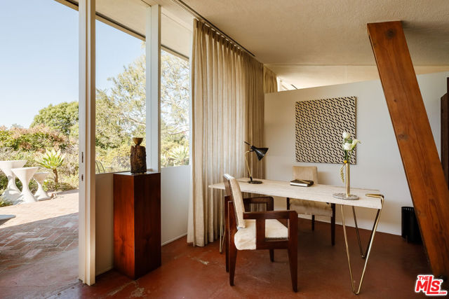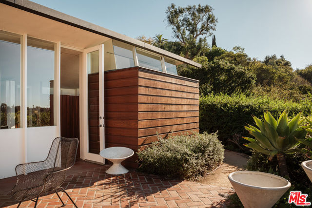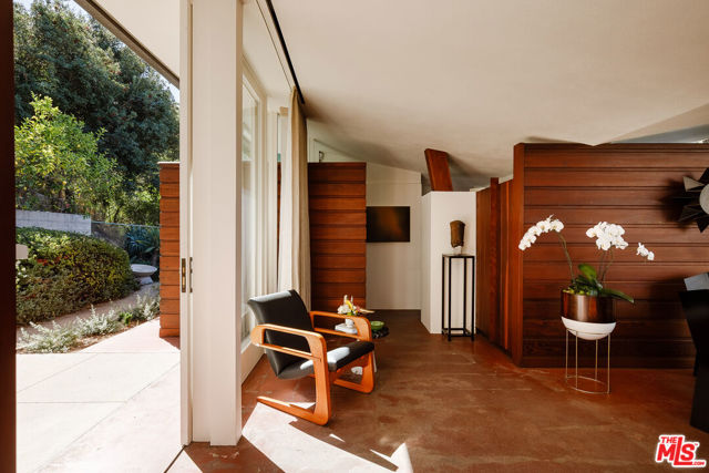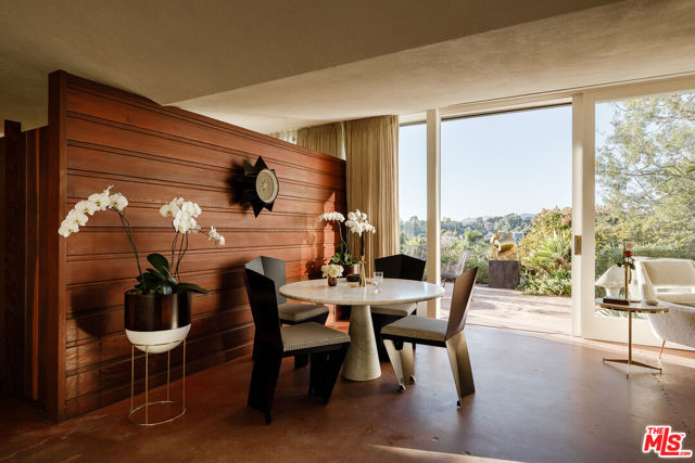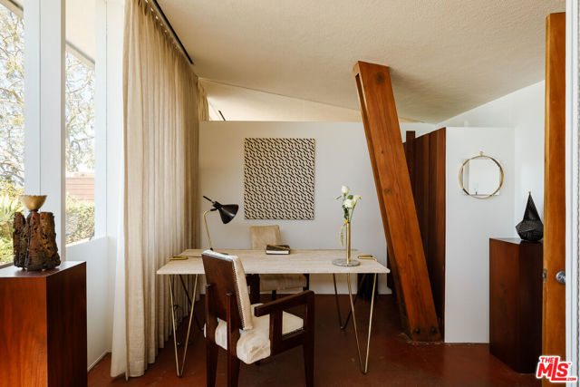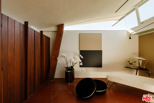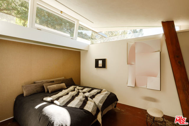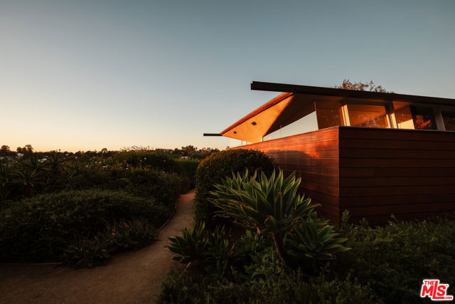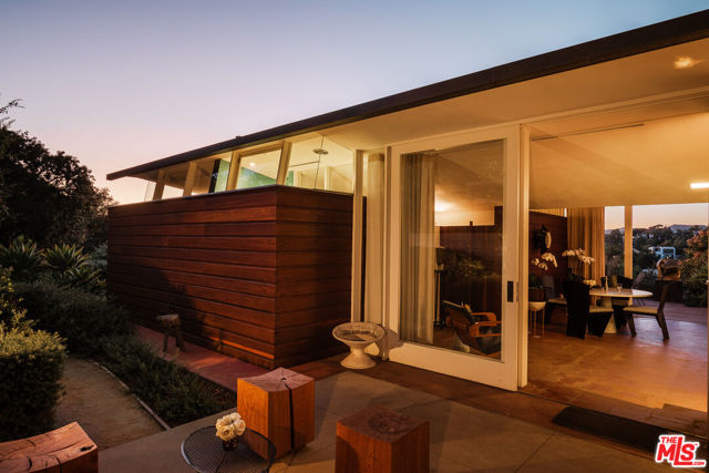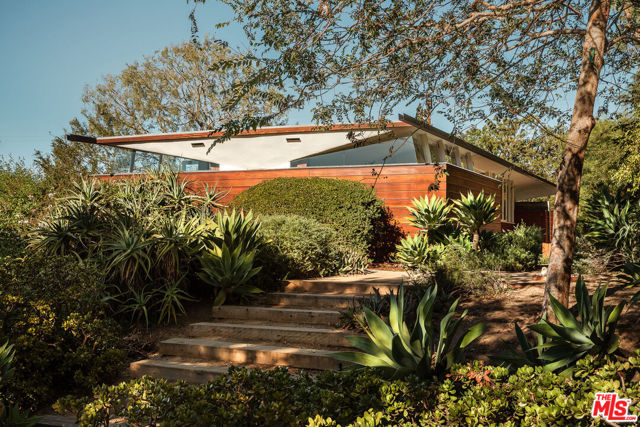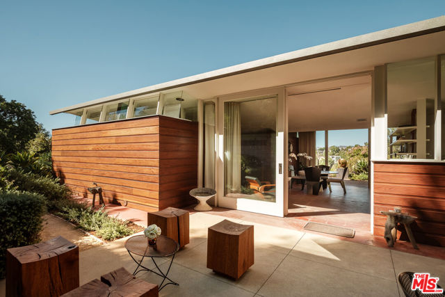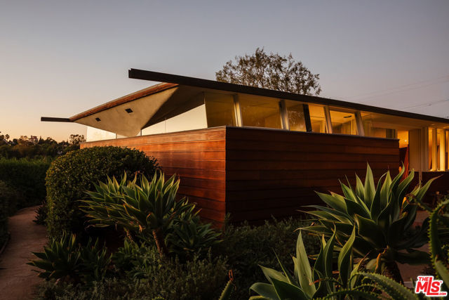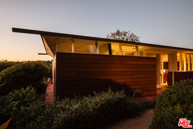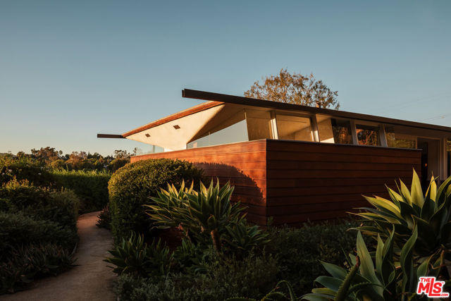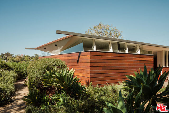 John Lautner, FAIA, Architect | Jules Salkin Residence, 1948 | Los Angeles Historic-Cultural Monument No. 1111 | Renovation by Barbara Bestor, FAIA, Architect. Here on more than a third of an acre in the hills of Echo Park, with panoramic views down the canyon all the way to the ocean in Santa Monica, this early mid-century modern work by the architect incorporates elements learned during his six-year apprenticeship with Frank Lloyd Wright, in addition to the bold experimentation that would come to define his personal oeuvre. On one hand, Wright's principles of the low-cost Usonian house are clearly visible: a small footprint, an emphasis on horizontality, a restricted palette of materials, the principles of compression and release, and the use of board-and-batten redwood siding. On the other hand, Lautner was playful in his expression of the overall form: seven pairs of triangular Douglas Fir timbers create a spine for the house, supporting an upside-down triangular truss roof with little need for structure at the perimeter, lifting the ceiling plane up toward the sky, and allowing glass walls and sliding doors to connect directly to the landscape. Commissioned speculatively by polymath (concert violist, contractor, developer, architect, and attorney) Jules Salkin, one of the four studio musicians that founded the Crestwood Hills architectural community in Brentwood, the home was lost to history through decades of ownership by the original family, including additions and remodels that made the home almost unidentifiable. Fortunately, in 2014 the home was rediscovered by the current owner, who painstakingly researched the property's pedigree, removing additions and reducing square footage, to restore the property to its original condition, in collaboration with architect Barbara Bestor. The result is a successful marriage of old and new, where original details have been preserved, alongside new finishes that have been introduced compatibly. Butt-glazed clerestory window conditions have been recreated, woodwork has been stripped, the fireplace and chimney details have been corrected, and the Cherokee red concrete floor retains its patina. Simultaneously, contemporary kitchen and bathroom finishes give the home new life, with black phenolic resin countertops, hand-made ceramic tile, new built-in appliances, and attention to detail throughout. Historic landmark status may allow for Mills Act application in the future, with the possibility of substantial property tax savings.