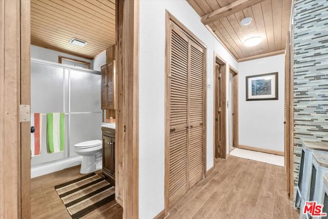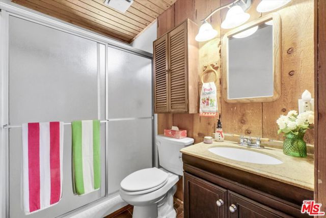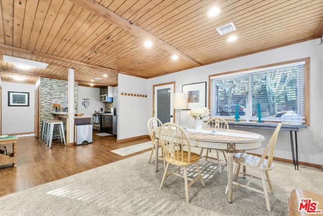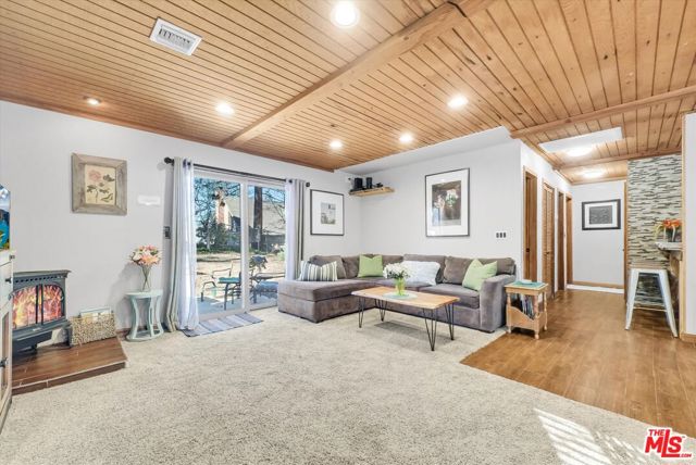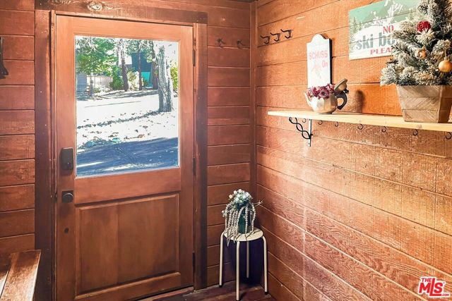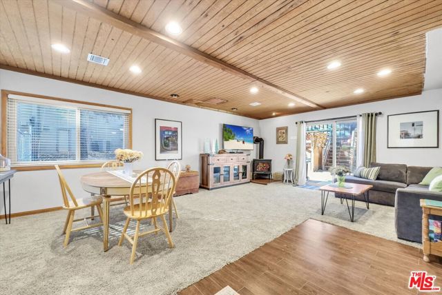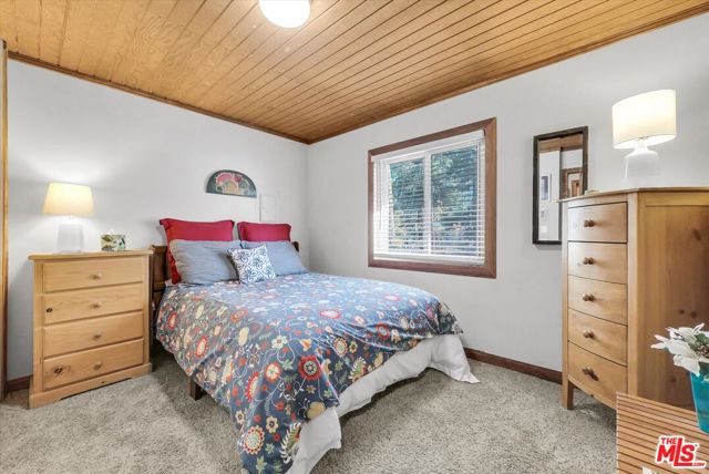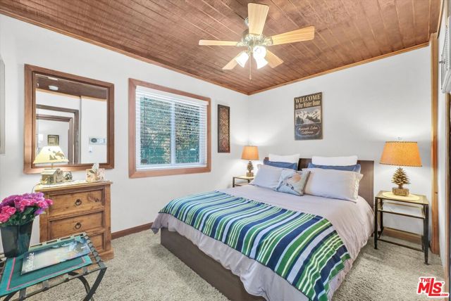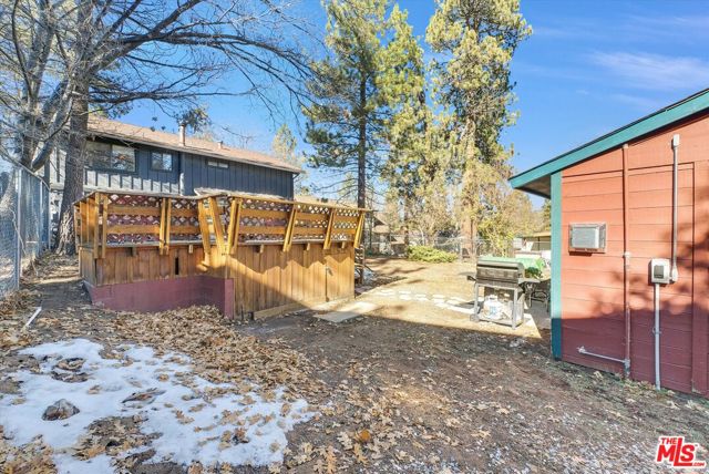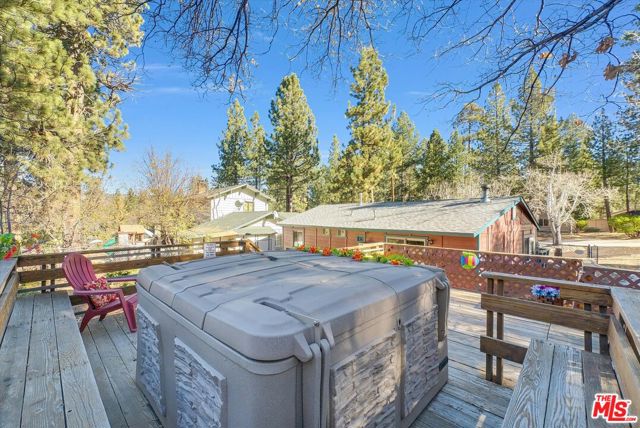 What better location for a vacation rental/weekend getaway then the Summit Estates area of Big Bear Lake neighboring Snow Summit Ski Area Resort! A year-round resort with Winter snow sports like skiing/boarding/tubing and a Summer gathering for mountain biking, hiking and scenic chair rides. First house at the top of the street on St. Moritz Dr., just below Switzerland Dr, a snowball toss to the resort. This is a very sought after location in Big Bear Lake. Situated on a large flat level fenced lot, the expansion possibilities are there to be realized. Circular paved driveway brings you in with room for boat or RV parking on site. Classic Sierra style architecture offers an open floor plan. This cabin is turnkey and ready to go. Cute front porch with wrap around built in seating. Enter thru the wooded "mud room" for seasonal convenience. Ample sized living room with tasteful furnishings throughout. Dining area with corner windows offering light and vistas. Lovely antique table and chairs with room to seat 6. Updated kitchen offers a breakfast bar with seating, granite counters, stainless appliances, & pantry. 2 spacious bedrooms with queen beds. Both bathrooms are lined with pecky cedar for a rustic feel. Lovely solid wood mahogany interior doors and wood ceilings throughout the home. Forced air central heat to keep everyone nice and toasty. Washer/dryer hookups in the stackable closet off the hallway. Exit sliding glass door to back yard open concrete patio with seating and BBQ. Fully fenced rear yard with raised deck and outdoor spa. Raised deck has built in seating and room for dining, as well as a bubbly spa/hot tub. This is an excellent investment opportunity to own a home in a year-round resort, that has the potential to pay for itself, as well as generate income. Just in time for the coming Winter Season.