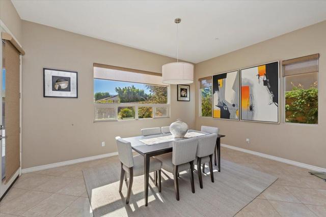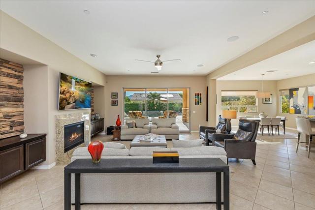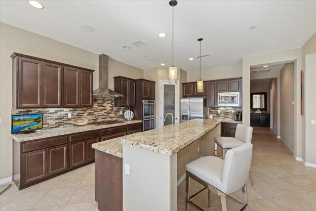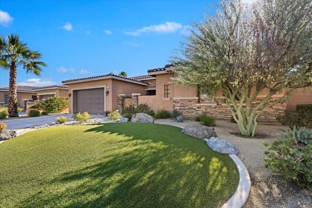Stunning, immaculate home located on a quiet cul-de-sac in Encore, Palm Desert. This beautiful 2014-built single-story home has been highly upgraded and fully customized by the original owner. With a 10,018 sq ft lot, there is ample room for sitting in the sun or shade in the south-facing back yard which includes a sparkling pool with sun shelf, waterfall from jacuzzi, putting green, and extended covered patio with a built-in barbecue. The light-filled interior has an open floor plan, high 10 ft ceilings. Off the great room, an addition of a full bar is great for entertaining and watching sports, fully equipped with an ice maker, drink refrigerator, cabinetry, sink, and granite countertops. A sound system throughout the house and patio sets the mood for calm relaxation, or a fun party atmosphere. Custom window treatments help control the light in every room. The kitchen with island has stainless steel appliances, two ovens, granite countertops, tile backsplash, and beautiful cabinetry. The primary suite has direct access to the pool area, large walk-in closet, tiled shower, soaking tub and dual sinks with granite countertops. HOA fees are very low at $75 per month. Close to shopping, restaurants, Cal State and UC Riverside Universities, this home has it all!