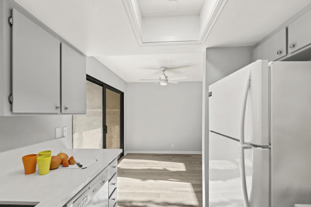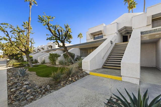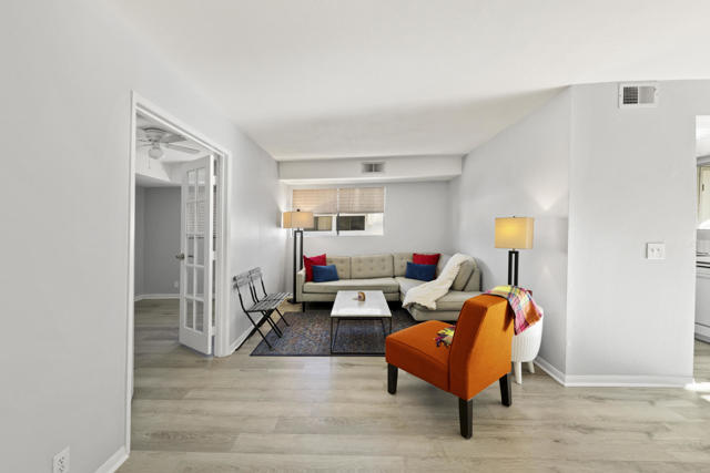 This beautiful Palm Canyon Villas Condo is light, bright, and airy. It has been freshly painted in light gray and white colors, which blend seamlessly with the new laminate flooring. The primary bedroom is spacious enough for a king-sized bed and features a private en-suite bath with a tub/shower combination and double mirrored closet doors. The secondary bedroom is flexible and would make a great den or office space.The kitchen appliances are included, and the cabinets have also been recently painted. The unit features a private laundry space on the large balcony, which also offers room for a table and chairs or a nice, oversized lounger. A lovely grapefruit tree enhances privacy and provides a scenic view.The location is highly convenient, situated close to one of the five pools and five spas, and near the tennis courts. It is within walking distance of local shopping and a drug store. The condo is just minutes from Palm Springs street festivals, dining, shopping, and excellent golf courses.Currently, 5-day short-term rentals are allowed (please verify details with the City of Palm Springs), making this an excellent investment opportunity or a perfect weekend retreat.