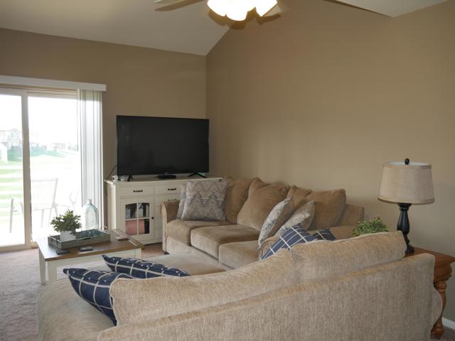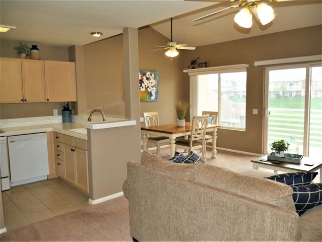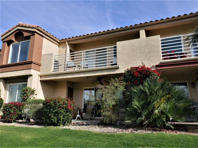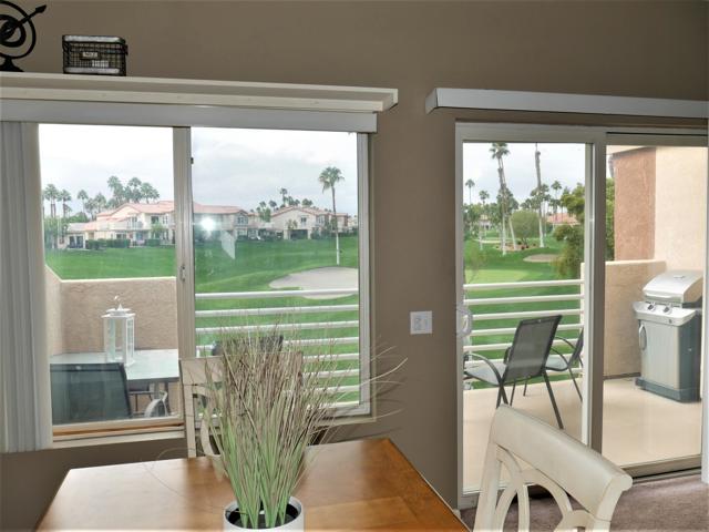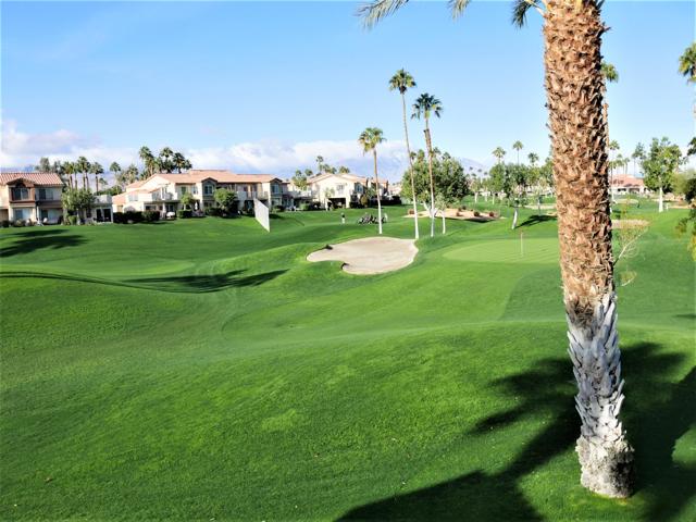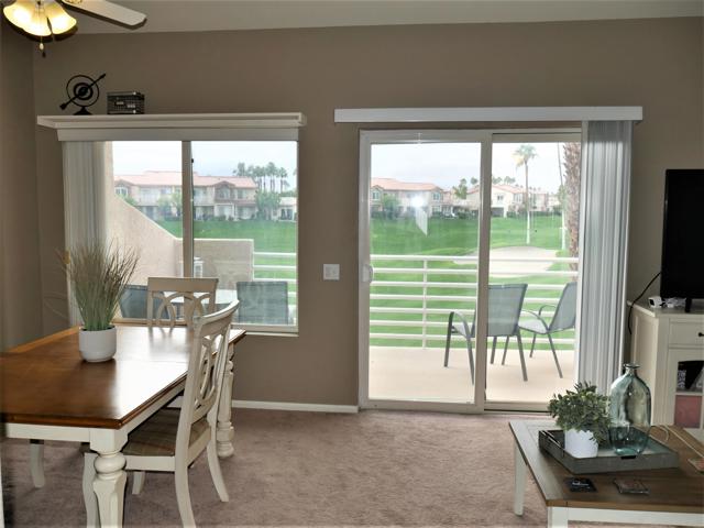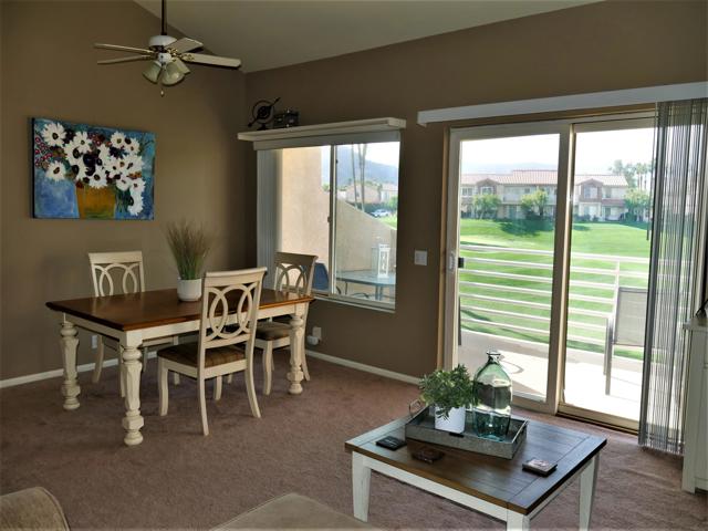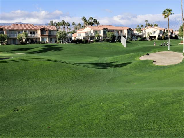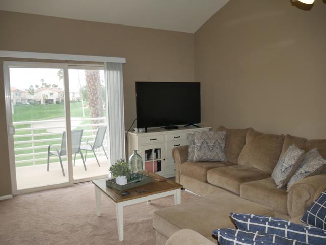 Enjoy panoramic fairway and mountain views from the west-facing balcony of this upper-level condo. Beautifully decorated in warm, neutral tones and offered furnished. This inviting home features vaulted ceilings in the main living area and upgraded energy-efficient ceiling fans. Newer HVAC for energy savings. The building was constructed more than 10 years after most of the complex, offering modern amenities and design. Located in a quiet, interior section of the community, you'll also enjoy convenient access to the pool and spa. The inclusion of a 1-car garage adds practicality to the package. The complex's amenities include 6 community pools and spa areas, to provide ample opportunities for relaxation and recreation. The added perk of UNLIMITED golf on a Ted Robinson designed par 3 course. Enjoy tennis and pickleball courts that are well maintained. Now the area headquarters for Helix Disc Golf, which enhances lifestyle appeal. Low HOA dues covering essential services, cable, and internet make for worry-free living, while convenient access to shopping, dining, and transportation adds to the property's allure. Situated across from the Indian Wells Tennis Gardens, home of the Paribas Open, this property is perfect for either full-time residence or a luxury seasonal home. Overall, it truly offers a lifestyle of convenience and luxury, appealing to those seeking the ultimate in comfort and relaxation.