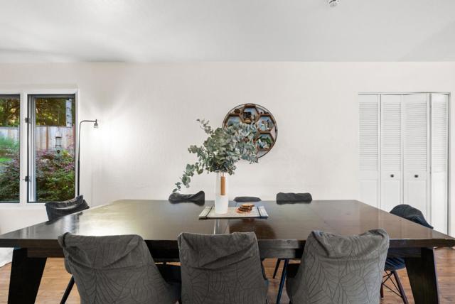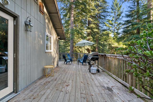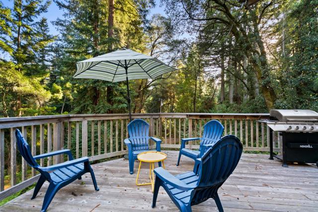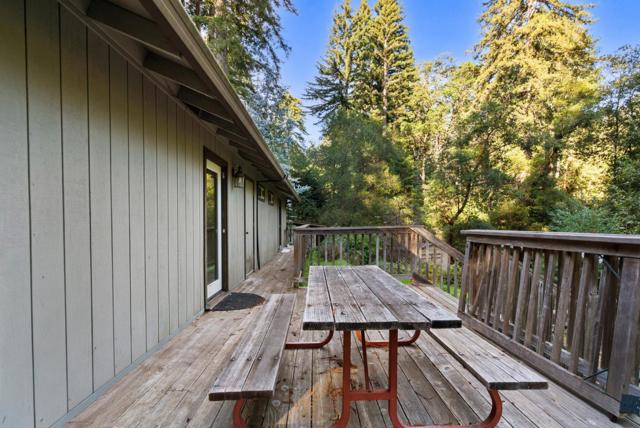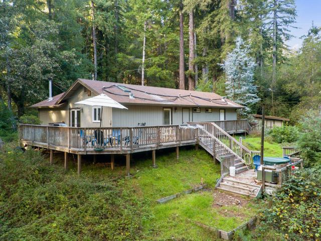 Welcome to this charming 2 BR, 2 BA single level home nestled in serene Bonny Doon. Spanning 1,329 ft, this delightful residence offers a cozy living experience set on a spacious 1.43 acre lot. The kitchen is a haven w/ butcher block counters, an island, & electric appliances including an oven range & cooktop. The family room and dining area seamlessly integrate with the kitchen, creating a warm and inviting space perfect for gatherings. Extensive wrap around decking allows for a delightful blend of outdoor living, grilling, soaking in the wood fired hot tub or strolling down to year round Mill Creek. North coast beaches are a short drive away! The home boasts a variety of flooring options such as laminate, carpet, and vinyl/linoleum, catering to diverse style preferences. A wood stove and electric heating ensure comfort during cooler months, while double pane windows enhance energy efficiency. Additional amenities include a walk-in closet and convenient inside laundry with a washer and dryer. The property includes miscellaneous structures such as a shed and workshop, offering ample storage and creative space. Located within the Bonny Doon Union Elementary School District, this home presents a wonderful opportunity for those seeking a peaceful retreat with abundant amenities.