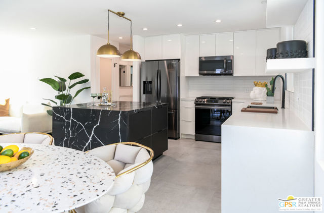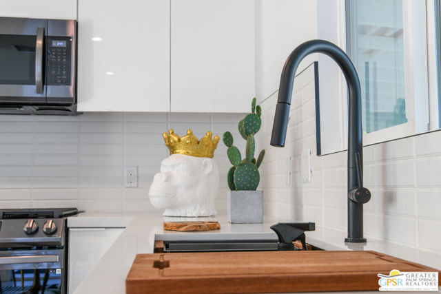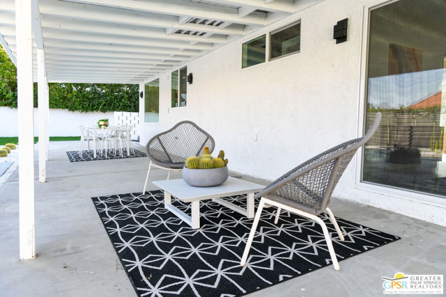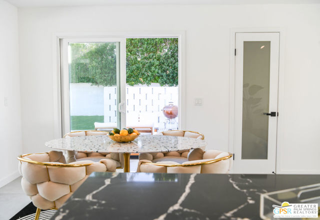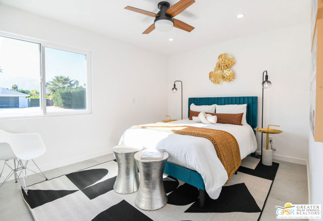 Reimagined and redesigned for the ultimate Palm Springs lifestyle, this beautifully remodeled home delivers style, comfort, and effortless indoor-outdoor living. From the moment you enter through the front courtyard, you're greeted with sweeping San Gorgonio mountain views, an ideal setting for morning coffee or sunset cocktails. Inside, the open-concept great room showcases an expanded kitchen that seamlessly flows into the living and dining areas, creating a perfect environment for entertaining or relaxing. The kitchen features a spacious island, modern soft-close cabinetry, quartz countertops, stainless appliances, upgraded fixtures, and sink outfitted with all the modern conveniences. The backyard is a true resort oasis. A sparkling pool with tanning shelf, submerged umbrella stand, and a cascading spa invites all-day lounging. Enjoy evenings around the in-ground fire pit surrounded by a lush lawn, desert landscaping, and privacy-enhancing block walls with a sleek staggered black corrugated metal fence. The oversized lot offers rare flexibility; RV parking with gate access, and ample room to add a custom cabana, outdoor kitchen pavilion, or even an ADU (buyer to verify), making this a property with both luxury and potential. With dramatic west-facing mountain views in front and serene pool/spa views in back, this home captures the very essence of Palm Springs living. Full list of upgrades available upon request. Furnishings may be purchased outside of escrow.