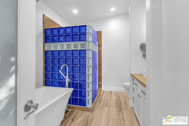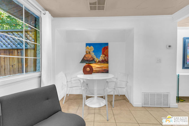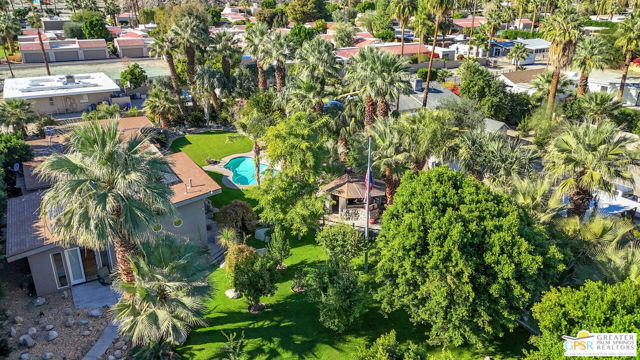 Welcome to 70142 Mirage Cove, a private and gated Rancho Mirage estate set on more than an acre of beautifully curated, park like grounds. Enclosed by a tall wall of mature Ficus and framed by dramatic desert mountain views, the property carries a peaceful, almost hidden quality that sets it apart from anything else. The main residence blends mid-century character with thoughtful modern updates. Iconic round windows, high beamed ceilings, and light plank floors create an inviting and refined foundation, while natural light highlights distinctive architectural touches. True dual primaries elevate daily living, while refreshed lighting, paint, kitchen finishes, and tankless water heaters provide thoughtful modern updates. With four bedrooms and three bathrooms, plus an attached enclosed two-car garage, the main home offers comfort, flexibility, and architectural charm in equal measure. At the far edge of the property, the detached guest house is its own private retreat. Set behind another electric gate and featuring a full kitchen, separate bedroom, bathroom, laundry, and patio, this ADU is ideal for multi-generational living, extended guests, a caregiver, or fully independent quarters. The separation from the main home creates a sense of privacy that is rare and incredibly valuable. For hobbyists, creatives, or RV owners, the newly constructed oversized RV and two-car garage is a standout feature. Full RV hookups and generous workspace make it well suited for automotive enthusiasts, woodworking, storage, or large-scale projects that require room to imagine and build. The property also includes leased solar for added efficiency. The grounds have recently been enhanced with new irrigation and professional landscaping, creating an environment that feels both intentional and delightfully unexpected. Mature trees, open lawns, shaded sitting areas, and a charming tree house contribute to a sense of whimsy that makes the property feel truly magical. Every corner offers a quiet moment or a thoughtful detail waiting to be discovered. This is an exceptional opportunity to own a private Rancho Mirage compound in a setting that feels like a hidden desert retreat. Come experience the serenity and beauty of this sanctuary today.