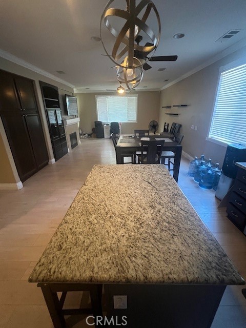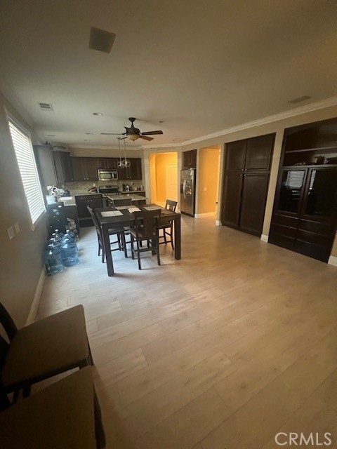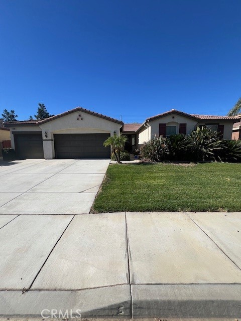 Excellent curb appeal! This single-story 4 bedroom 2 bath home is located in the prominent master-planned community of Heritage Lake. The property boasts a large living and family room. The house features 2,539 sq. ft., stainless steel appliances, open kitchen with island, office with barn doors, granite countertops, recessed lighting, fireplace, dining area, built-in entertainment center, laundry room with sink, hallway linen cabinets, laminate flooring, ceiling fans, wainscoting, crown molding, rain gutters, gated dog run, alarm system, security camera system, landscaped front yard, landscaped back yard, and a 3 car attached garage. The primary suite includes a walk-in shower, bathtub, dual sinks, and a walk-in closet. The office can be converted into a fifth bedroom. The backyard is accessible from the family room and features a lattice patio, covered patio with ceiling fans, TV connection with mount, gated dog run, and a cascading water fountain. The community includes a club house, lake, pool, dog park, barbecue area, and walking trails. You must view the home to truly appreciate!