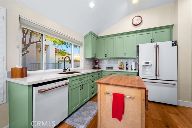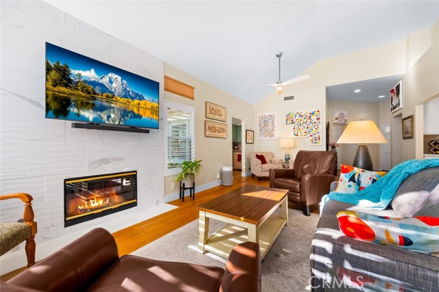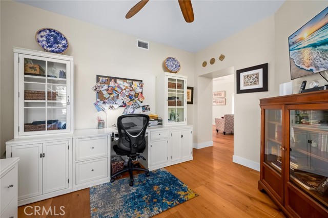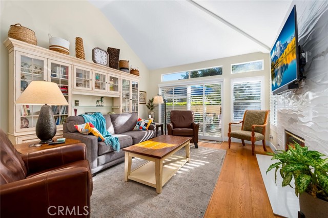 One of our favorites and soon to be yours within the 55+ Palmia community! Single Level, Two Bedroom PLUS Den/Office & Two Full Baths. This one is a Charmer with a Delightful Location and Fabulous Floor Plan. Entry way leads to a Great Room with Vaulted Ceilings and an Updated floor to ceiling Fireplace surround. Office/Den (no closet or door but could be added) is toward front of home with Bedrooms on opposite wings. Home features a FABULOUS REMODELED Kitchen with newer cabinetry, Quartz countertops, and GE appliances with Upgraded copper handles. Kitchen has a charming Nook for dining, Soft close Cabinetry, Light and Bright with several Windows overlooking the Greenbelt. Beautiful French Oak hardwood flooring, Plantation Shutters, and Ceiling Fans adorn the home. Decorator Wall in Secondary Bedroom. Primary Bedroom has Patio Access and also a REMODELED Ensuite bath - Walk in Closet, Dual Vanities and Shower. Both bedrooms have closet organizers to maximize the space. The Yard features areas for planting, dining and enjoying the outdoors. Patio Wall was built higher for added privacy and there is a gate direct for easy access to Greenbelt. The 2-Car Garage has an extended area for Washer/Dryer, Built in Cabinetry and Epoxied garage floor. Additional features include hideaway screen at front door, the home has been re-piped, newer water heater, newer heating/air conditioning units and Air ducts. Residents enjoy the Palmia Amenities including Clubhouse, Fitness Center, 3 Swimming Pools/Jacuzzi's, 18-hole Putting Green, Pickleball and Tennis Courts, Bocce, Shuffleboard +++. Mission Viejo Lake is also part of the Homeowners Association Amenities. This home is FABULOUS!