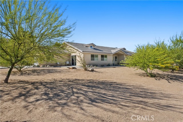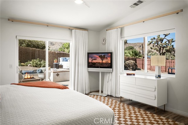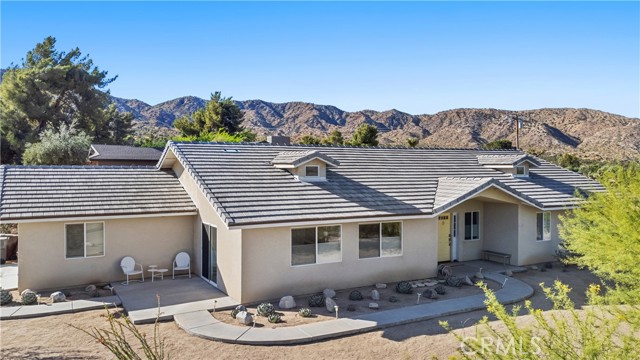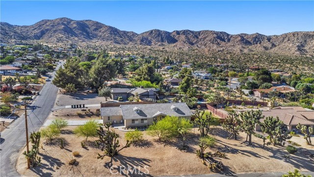 Set against sweeping mountain views in one of the area’s greenest and most established neighborhoods, this beautifully maintained 3-bedroom, 2-bath home with bonus room sits on a prime half-acre corner lot in desirable Country Club Estates. A mature, tree-lined front yard with lush desert landscaping creates exceptional curb appeal and a welcoming arrival. No HOA. Newly paved streets, connected to public sewer and natural gas, school bus stop, and a short walk to the area’s only golf course and popular café, The Roost. Conveniently and centrally located just a short drive to Joshua Tree, Pioneertown, and Palm Springs. The open-concept layout features high ceilings and abundant natural light, with mountain views visible from most rooms. Modern fixtures, ceiling fans throughout, custom blinds and curtains, and stylish flooring create a comfortable and inviting interior. The large primary suite offers a spacious bathroom with dual vanities, extra large soaking tub, walk-in shower, and a generous walk-in closet. TVs are included in all bedrooms. The fully fenced backyard is designed for entertaining and relaxation, featuring a custom patio with built-in gas fireplace and seating, raised lookout deck with outdoor queen bed, 4-person hot tub, oversized cowboy tub, shaded dining area, BBQ, and beautifully landscaped desert grounds. Additional features include a fully equipped kitchen with modern appliances, electric fireplace, laundry room with newer washer/dryer, attached two-car garage, and rare concrete roof. Offered fully furnished except for select staging items; buyers to request exclusions list. Property is move-in ready and perfectly suited as a full-time residence or an effortless desert getaway.