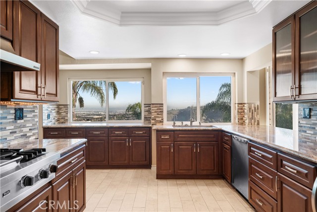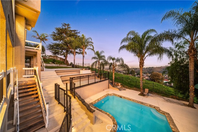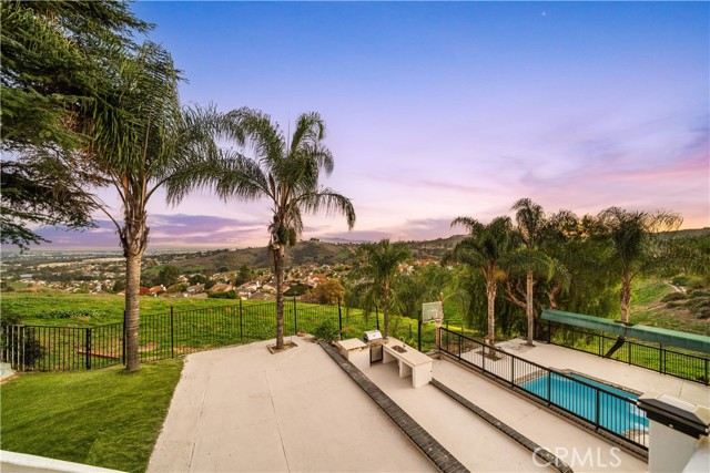 Location and View! Discover breathtaking panoramic mountain and city-light views from this stunning tri-level residence, perfectly situated in one of the most desirable neighborhoods in North Chino Hills. Set on an expansive 12,980 SqFt lot, this estate offers 4,931 SqFt of luxurious living space, resort-style outdoor amenities, and a layout designed for comfort, privacy, and unforgettable views from nearly every room. A grand double-door entry welcomes you into a soaring high-ceiling foyer and an open, light-filled living area. The formal living room features a beautiful fireplace, creating a warm and inviting ambiance that complements the spectacular views framed through the large windows. The kitchen has been tastefully renovated with custom cabinetry, granite countertops, and a spacious layout perfect for cooking and gatherings. The adjoining formal dining room and family room all overlook the scenic panorama, enhancing the indoor–outdoor living experience. The main level offers exceptional convenience with three bedrooms and three bathrooms, including a well-appointed primary suite. The lower level, ideal for multi-generational living, features two additional bedrooms, a second primary suite, and a spacious living/entertainment room—all enjoying the same sweeping mountain views. On the top floor, you’ll find a large bonus room, a dedicated gym, and an oversized view deck, offering the perfect space for family activities, relaxation, and entertaining while taking in the 180-degree vistas. The backyard retreat is designed for true California living, boasting a sparkling pool & spa, BBQ island, expansive hardscape, and multiple seating areas. The outdoor space is perfect for gatherings, gardening, or future customization. The charming front yard features a tranquil bridge and water element, giving the home an elegant, storybook appeal. Located minutes from top-rated schools, shopping centers, parks, and major freeways, this home delivers luxury living with unmatched convenience. Experience extraordinary views, a thoughtfully designed layout, premium upgrades, and a rare opportunity in North Chino Hills.