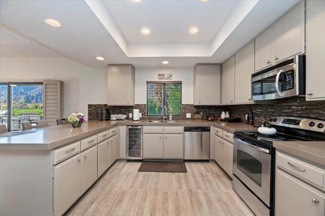 Outstanding home with breathtaking mountain and golf course views enjoyed from both the interior and multiple patios. All three bedrooms are en-suite, each offering privacy and access to its own patio. The chef's kitchen features stainless steel appliances, a wine refrigerator, quartz countertops, and a beautifully accented backsplash. Gorgeous flooring throughout enhances the home's refined feel. Exceptional outdoor living with space to BBQ and relax while taking in the scenery. Ideally located within walking distance to Old Town La Quinta's renowned dining, shopping, and the iconic La Quinta Resort & Club.