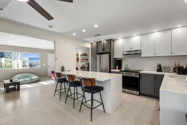 Experience desert living in this beautifully remodeled Mid-Century Modern gem at 66970 Desert View Avenue, Desert Hot Springs. This home offers over 1,100 square feet living space. The open-concept layout features brand-new wood-like tile flooring throughout, complemented by quartz countertops, recessed lighting, and updated appliances. This home is equipped with a solar system and a water softener substantial savings on your electric bills.Situated on an elevated lot, the property boasts panoramic south-facing views of Mt. San Jacinto. The home is conveniently connected to the city sewer system. With a lot size of approximately 7,841 square feet, there is ample room to add a pool or an ADU. Located just blocks from downtown Desert Hot Springs and only 15 minutes from the vibrant energy of Palm Springs, this property is perfect for a primary residence, a vacation getaway, or an investment opportunity.