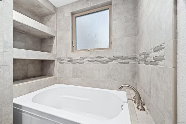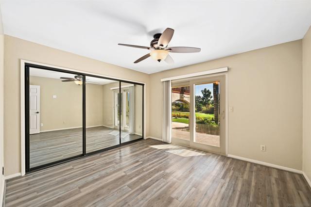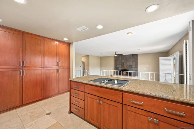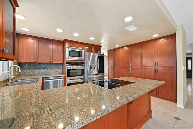 Set on a rare .39-acre golf-course lot in San Diego, this custom residence offers sweeping fairway views from every room. Thoughtfully designed for indoor-outdoor living, highlights include sliding glass doors in every bedroom, a dramatic spiral staircase with skylight, a large second-story deck, veranda, and custom stone patios. The home features travertine tile in the kitchen, family room, and hallways, vinyl plank flooring (2021), and beautifully remodeled kitchen and baths. All rooms are hard-wired for Ethernet with a dedicated lower-level access point. Energy-efficient upgrades include owned solar (2020) with no electric bill, a new solar battery and inverter (2025, under warranty), and a 2023 heat pump and AC system. Approved, paid-for permits and architect plans are in place to convert additional living and dining rooms into a studio ADU with its own address (9221). Outdoor amenities include mature gardens, fruit trees, water-efficient landscaping, stamped concrete, gazebo, shed, and multiple covered entertaining areas. A rare opportunity combining views, efficiency, and future flexibility—right on the golf course.