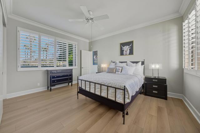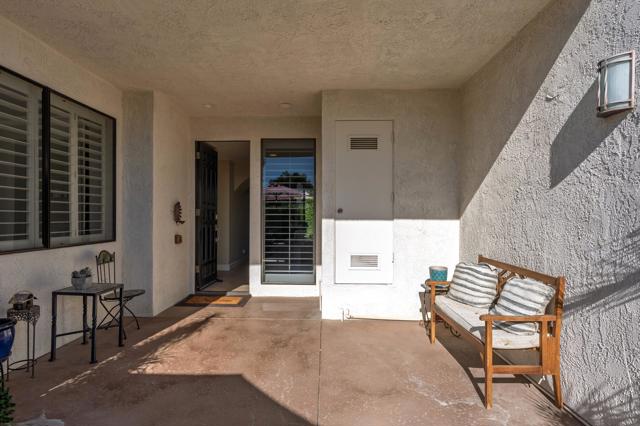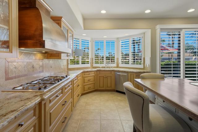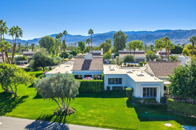 Welcome to 818 Inverness in the guard-gated community of Mission Hills Country Club, where privacy, views, and spacious living come together in one exceptional property. Located on a quiet end location, this residence features a long private driveway with an attached two-car garage plus a dedicated golf cart garage, offering convenience and generous parking for guests. Enter through the beautifully designed front courtyard that captures dramatic south-facing mountain views and provides a peaceful and private outdoor retreat. Inside, a large Great Room with beamed ceilings, walls of glass, an entertainer's bar and a fireplace opens seamlessly to the formal dining area, creating an inviting space for relaxing and entertaining. The chef's gourmet kitchen includes island seating, granite countertops, stainless steel appliances, and picture-perfect views overlooking the south and east-facing patio areas. The layout offers excellent separation of space with a spacious primary suite featuring stone-topped double vanities and a walk-in shower with bench seating. Two guest suites each offer ensuite updated baths and beautiful mountain views. A separate office provides flexibility for remote work, a gym or a bonus room. The back patio is extremely private and pet-friendly, perfect for lounging or dining outdoors. Updated systems, lighting, and flooring enhance the move-in-ready feel throughout the home. Offered furnished per inventory, making it ready for immediate enjoyment. The land lease has been extended to 2121, providing long term peace of mind. With a community pool and spa nearby and the park-like grounds of Mission Hills Country Club surrounding you, this is the ideal desert retreat. Property has been pre inspected with home inspection report available for your review.