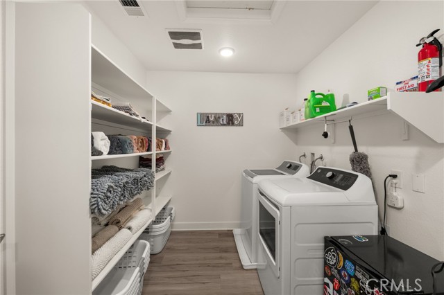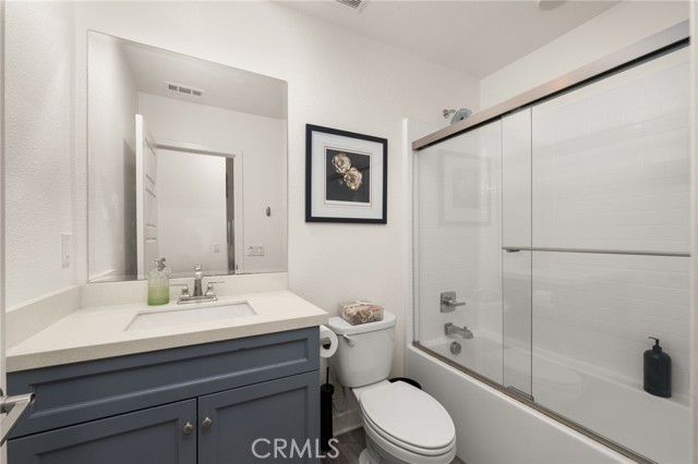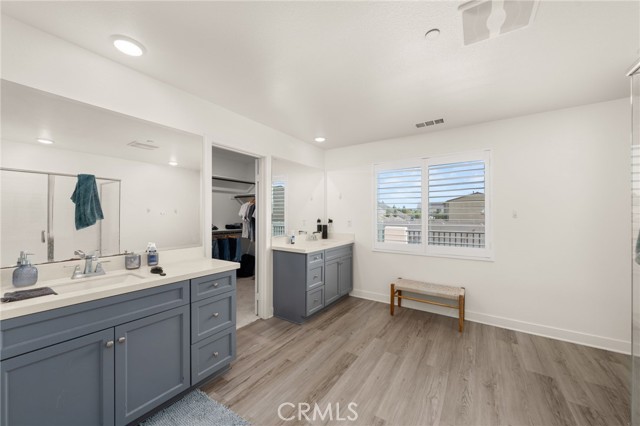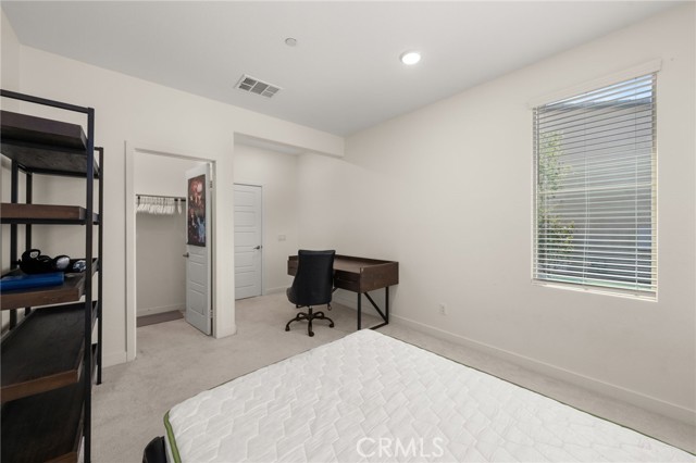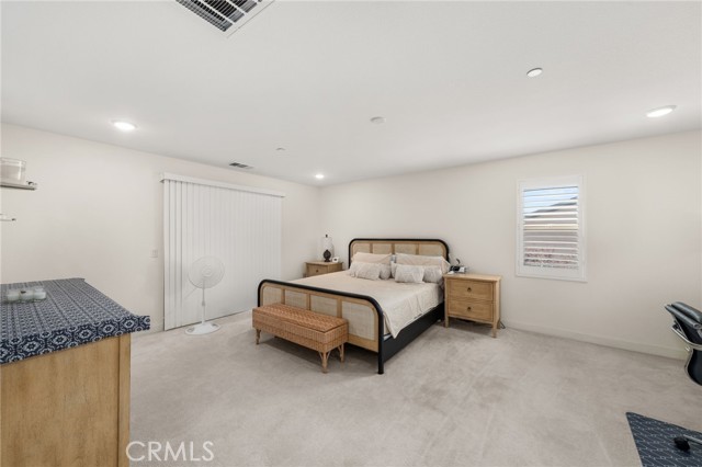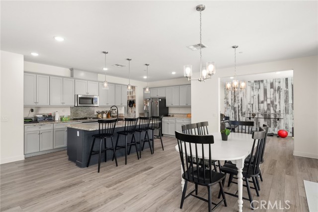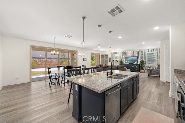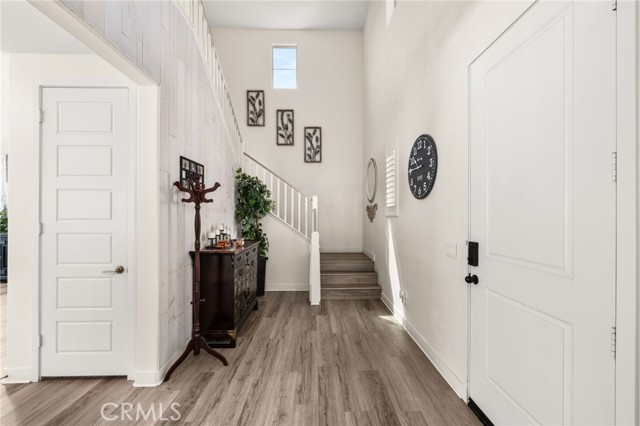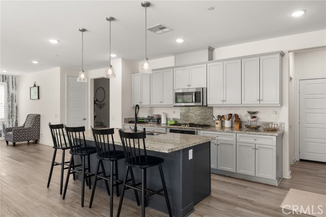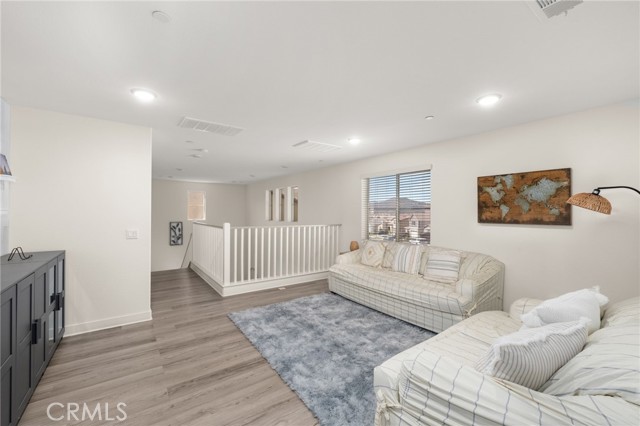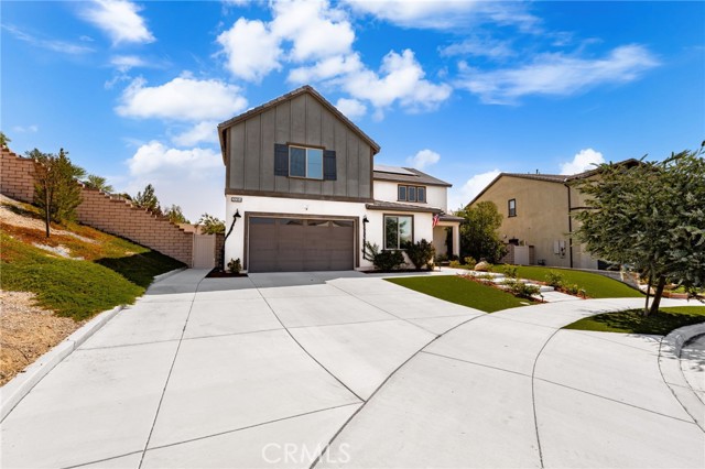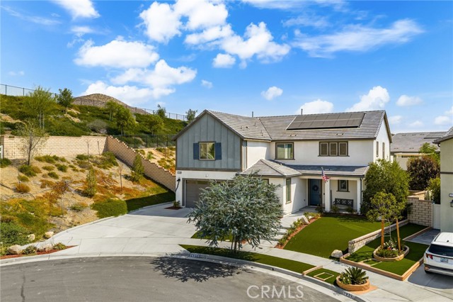 This beautifully upgraded 2021-built home offers 5 bedrooms, 3 baths, a downstairs office, and a large upstairs loft across 3,400 sqft. Located on a premium corner lot at the end of a cul-de-sac, with turf landscaping, a custom walkway, and 3-car tandem garage with EV charger. Open floor plan features high ceilings, luxury vinyl plank flooring, and a spacious Great Room with dual sliders and shiplap accent wall. The gourmet kitchen boasts granite counters, stainless steel appliances, grey cabinetry, a walk-in pantry, large island, and pendant lighting. Main floor includes a bedroom and full bath. Upstairs offers a large loft with custom built-ins, laundry room, 3 secondary bedrooms, and a luxurious primary suite with walk-in shower and dual vanities. Backyard includes Aluma wood patio cover, turf, and concrete hardscape. Resort-style community amenities include pools, spa, courts, trails, skate park, clubhouse, and schools nearby. Easy access to the 15 & 215 freeways and local shopping.