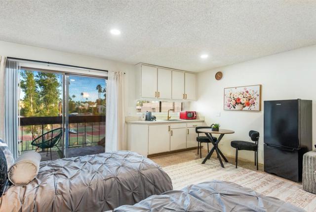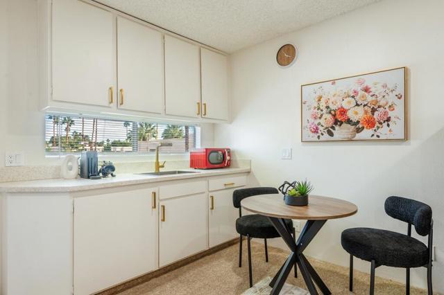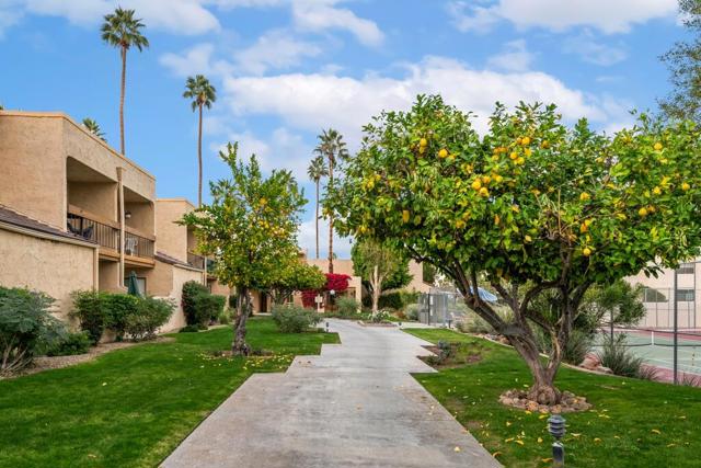 Exceptional opportunity to own a fully furnished, upgraded two-story townhouse-style condo in South Palm Springs. This spacious 1,048-square-foot residence offers one of the largest floor plans in the community and is one of only six units out of 205 featuring this rare two-story townhouse layout. The home includes two full bathrooms, multiple storage closets, and private outdoor spaces on both levels, providing an ideal balance of openness and privacy. The expansive upstairs primary suite functions as a true sanctuary, offering a generous sleeping area, a dedicated wet bar, private bathroom, and a large walk-in closet that can easily serve as a home office, creative space, or additional storage. The suite opens to a private balcony overlooking the tennis courts, creating a quiet and elevated living experience rarely found in condo living. Additional highlights include dual air-conditioning and heating systems with separate units for each floor, an in-unit washer and dryer, and a thoughtful floor plan designed for comfort and efficiency. Located in the highly desirable Palm Springs Golf & Tennis Club community, residents enjoy resort-style amenities including three heated pools, spas, tennis and pickleball courts, a clubhouse, and beautifully maintained grounds with mature landscaping and citrus trees. HOA dues include cable, high-speed internet with Wi-Fi, water, trash service, and exterior and roof maintenance. No land lease. Conveniently situated on the Tahquitz Creek Golf Course and close to grocery stores, restaurants, coffee shops, and hiking trails, this property is ideal as a full-time residence or desert retreat.