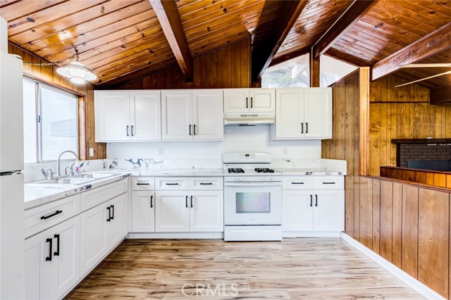 Truly an amazing mountain home!! New exterior paint, new roof, Termite Clearance, many updates throughout the property all combined with the existing knotty pine vaulted ceilings. Water-Proof laminate flooring, kitchen cabinets in great condition, sink, quartz countertops, recently remodeled bathrooms, carpet in bedrooms. Laundry room in basement. Property located at a very short drive from Lake Gregory, shopping, restaurants. This home has everything you need to enjoy the many outdoor activities Crestline has to offer all year long.