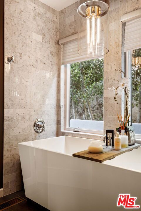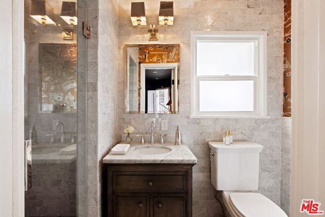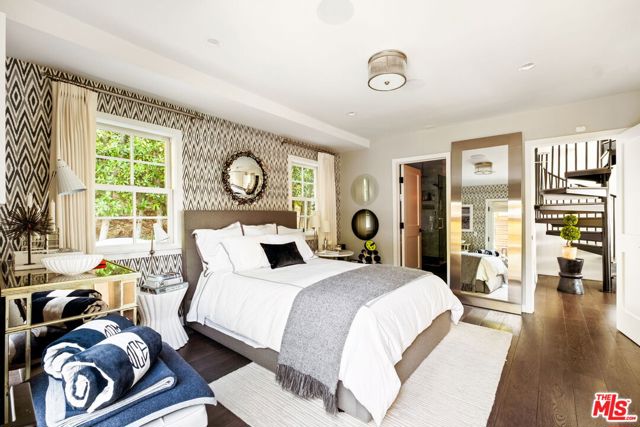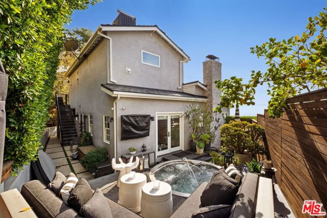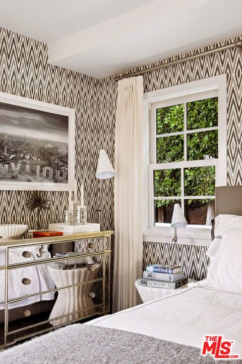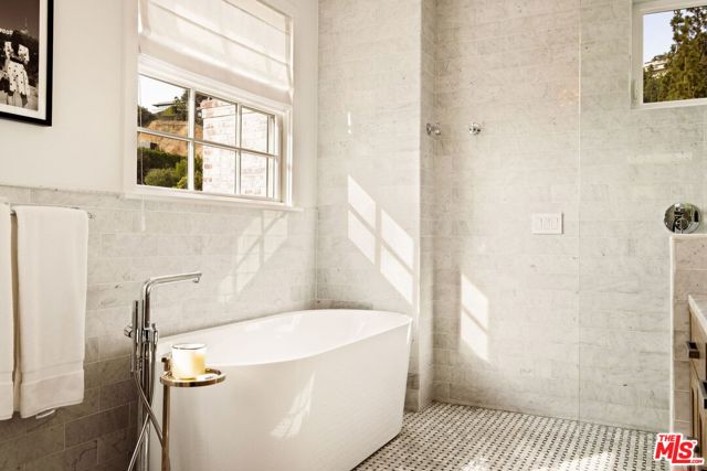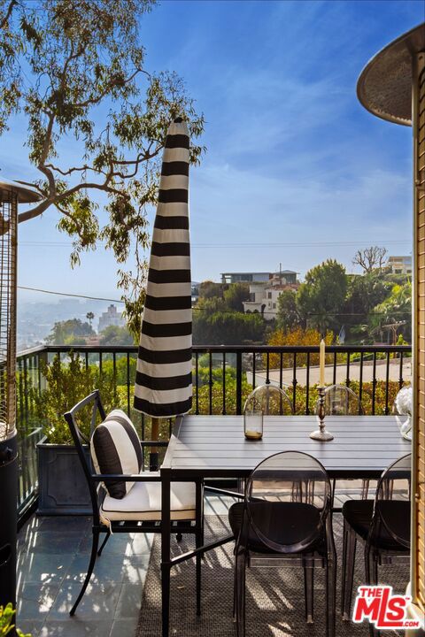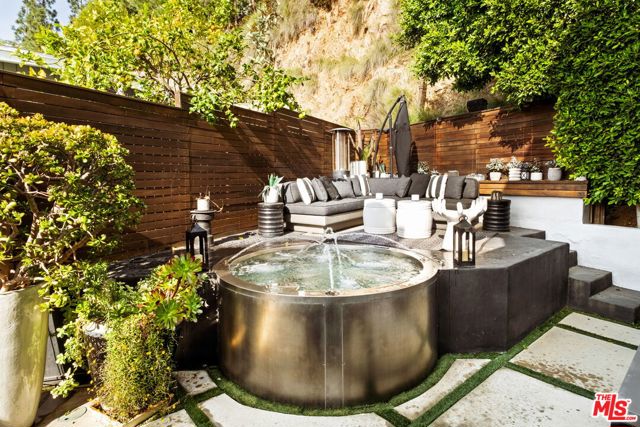 A truly rare offering, this meticulously renovated jewel box is set on one of the most coveted blocks in the Hollywood Hills. Showcasing spectacular views, elevated privacy, and sophisticated designer finishes throughout. A move-in-ready retreat just moments from the iconic Chateau Marmont. An open and airy living room, anchored by a statement fireplace, flows into a dining area and beautifully composed kitchen, all framed by inspiring vistas. Custom inset cabinetry, a Carrara marble island with polished nickel shelving and dedicated beverage station with wine refrigerator establish a refined aesthetic.Indoor and outdoor living blend seamlessly across both levels of the home. Terraces create multiple settings for entertaining, featuring a built-in BBQ, custom stainless steel hydrotherapy tub by Diamond Spas with fountain feature, deck seating, and outdoor television..ideal for both relaxed evenings and elegant gatherings. A serene guest suite on the first floor is accented by Ralph Lauren lighting and Martin Lawrence Bullard wallpaper includes an en-suite bath with a deep soaking tub and Restoration Hardware vanity. French doors open directly to the spa terrace, offering a tranquil, resort-like experience. A second bedroom, currently styled as a den is thoughtfully detailed with library sconces and Phillip Jefferies wallpaper. It connects to a Jack-and-Jill bath finished in Carrara marble and polished nickel, elevated by Donald Robertson's iconic Sunset Tower wallpaper. The entire upper level is dedicated to the primary suite; an inviting sanctuary defined by dramatic cathedral ceilings, Murano glass chandelier, and Phillip Jeffries wall coverings. Southern exposure fills the space with natural light, while a generous walk-in closet and spa-inspired en-suite bath complete the experience. The bath features dual vanities, a freestanding soaking tub, and basketweave marble floors. A private terrace with picturesque views provides a final, breathtaking view. A carefully curated residence that offers privacy, design, and effortless luxury...this is Hollywood Hills living at its best. A spotless two car garage with extra storage completes the picture. All outdoor furniture is included with sale.