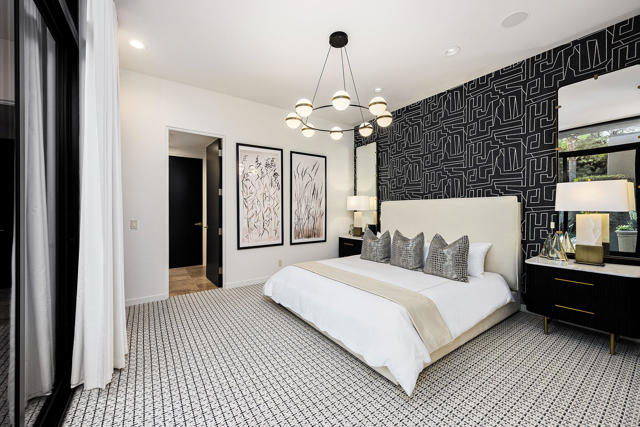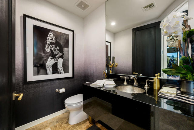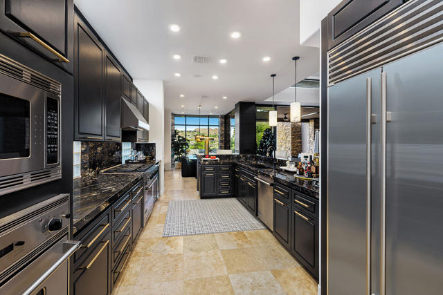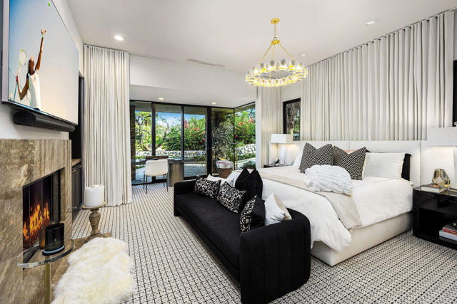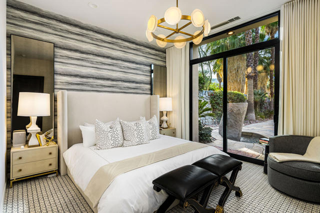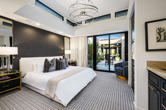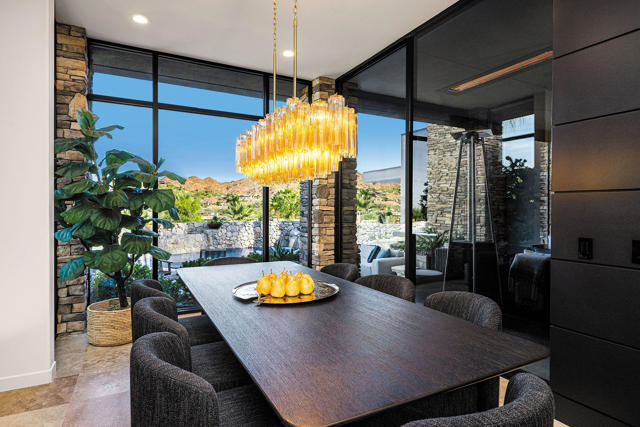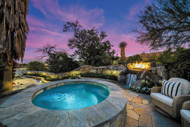 Nicely elevated with beautiful mountain views, this home offers sunrise views from the outdoor living room and pool, plus sunsets from the lushly landscaped entry courtyard. This private entry includes a sculptural water feature, bistro seating, natural granite walls and custom bronze gates. A glamorous great room evokes an elegant lifestyle with a casual flair; open to the kitchen and dining room, with high ceilings and contemporary wood-panel accents, sleek new fireplace, large-screen television, walk-up wet bar with sink and wine refrigerator. Natural light floods through clerestory windows and walls of glass, while sliding glass doors open to covered outdoor living and entertainment patio.The sophisticated dining room is perfect for dramatic dinners or casual meals; a soft backdrop for artwork on one wall plus floor-to-ceiling glass offers views to the entertainment patio and mountains beyond.A carefully coordinated extension of the dining room, the Kitchen feels dramatic in finishes, including stainless steel appliances, large breakfast bar with seating, and pantry storage; clerestory windows above cabinetry provide soft light. Comfort and privacy were thoughtfully considered in the design of this master suite, with direct access to entertainment patio, pool and elevated spa lounge area; custom window treatments, fireplace and television create a cozy environment, offering tranquil views and sounds from two separate water features; the bathroom features a spa tub, dual vanities and walk-in closets.The two interior guest suites are professionally designed with custom furnishings and window treatments; accessed from the private entry courtyard, both offer full bathrooms and closets; a separate-entry guest house includes refined built-in cabinetry, television, morning bar with sink, refrigerator, full bath and walk-in closet.Relax in your private outdoor oasis with stunning mountain views. Covered living room area with ceiling heaters and fan, a barbeque center with bar seating, fire pit seating, pool with waterfall, and additional deck for sunning. A separate elevated lounge area off the master suite includes a spa, second fire pit, patio with seating, running stream, waterfall and lush landscaping. Additional features include custom furnishings and window treatments, an air-conditioned two-car plus golf cart garage. Offered furnished per approved inventory.