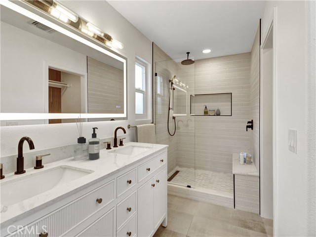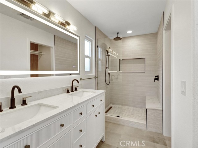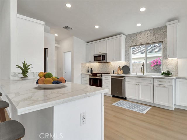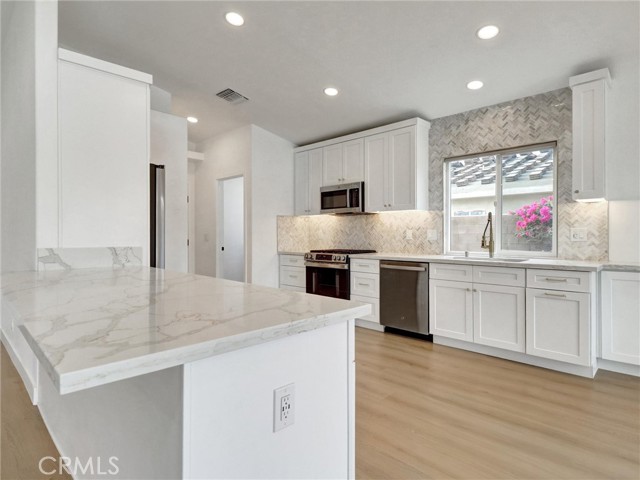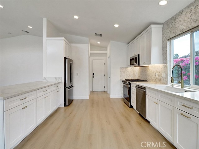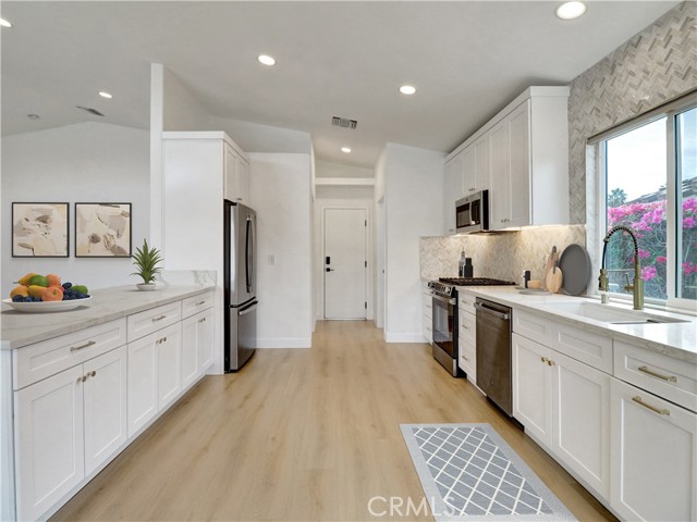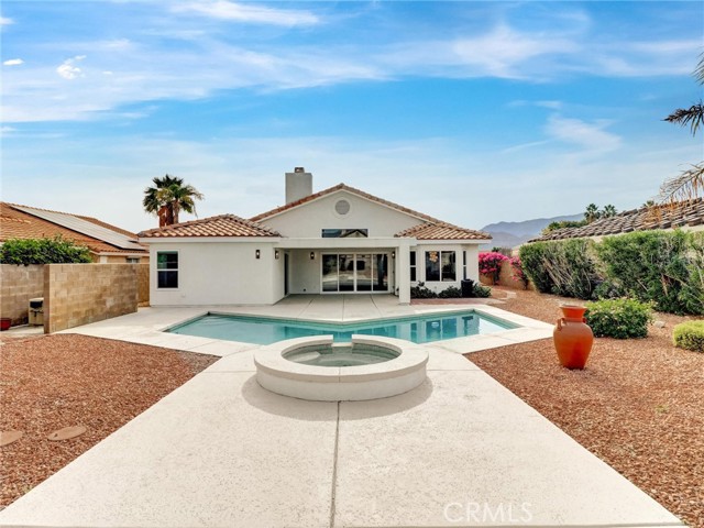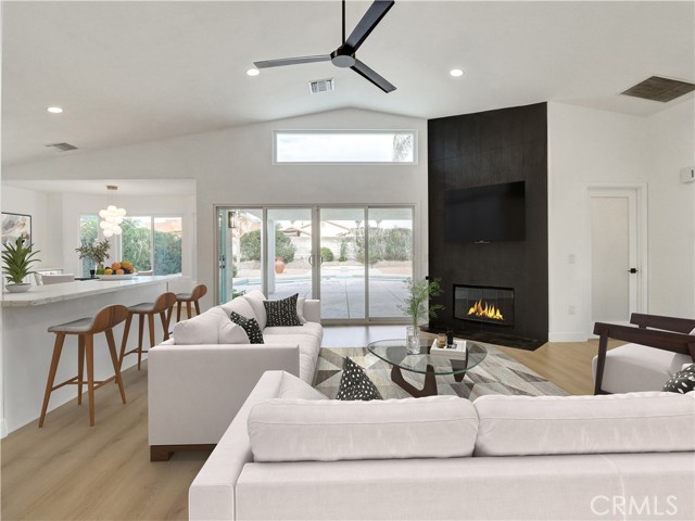 Luxurious 3 bed/2 bath 1623 sq ft designer home on an oversized lot on a quiet cul-de-sac in Cathedral City, just minutes from Palm Springs. Offering privacy, style, and modern comfort, it combines thoughtful design with high-end finishes rarely found at this price. As you enter, you’ll be stunned by the natural light, vaulted ceilings, and an open floor plan anchored by the gas fireplace with floor-to-ceiling tile. The spacious great room flows seamlessly into the kitchen and dining room, creating light and openness throughout. This stunning 2025 full remodel features all-new kitchen and baths, interior and exterior doors, dual-pane windows/sliders, new tile, remodeled pool/spa and refreshed landscaping, making it a true standout. The expansive kitchen offers white shaker cabinets, Calcutta Queen quartz counters, marble tile backsplash, undercabinet lighting, walk-in pantry and stainless GE appliance suite - gas convection & air-fry range, dishwasher, micro and counter-depth refrigerator. Directly across from the pantry is a separate laundry room, adding convenience and functionality. The primary suite includes recess lighting, modern fan, walk-in cedar closet and coffee bar with extra storage. It also provides direct access to the covered patio/pool area creating a seamless indoor-outdoor retreat. The spa-like primary bath has dual-sink vanity with quartz counter, custom shower with bench, Delta black/gold fixtures with rain shower head/wand. The hall bath is equally refined with designer vanity, Kohler toilet, Delta tub with custom-tiled surround. Two additional bedrooms provide ample closets and modern fans. Throughout the home, you’ll find new LVT floors, recess lighting, lami glass doors, new paint and new baseboard/trim. Major upgrades are new tile roof, newer HVAC system, new lighting, modern front door, water softener and dual-pane windows. Step outside to the covered patio overlooking the pool/spa area. The 2025 renovation includes new Pebble Tec, glass tile, Pentair variable pump and 400K heater. The backyard is a private oasis with mountain views and fresh landscaping. Additional highlights include a rare 3-car garage with openers, fully finished with attic storage, new paint and direct access to the home. To top it off, the home comes equipped with NEW, OWNED 18-panel 7.83KW solar system, delivering efficiency and savings. Located in a prime Cat City area, this home is close to Palm Springs vibrant entertainment, shopping and dining options.