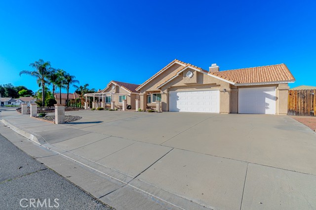 Welcome home! This beautifully upgraded single-story residence features 4 bedrooms and 3 bathrooms, offering comfort, style, and an open layout from the moment you walk in. The interior showcases elegant travertine flooring and numerous custom touches throughout. The spacious living room is perfect for entertaining, while the separate family room—complete with a cozy fireplace—opens to the kitchen. The kitchen boasts upgraded travertine countertops and an island that offer plenty of workspace for cooking and gathering. The primary suite offers a spacious and private retreat, featuring a well-appointed bathroom with dual sinks, a new walk-in shower, and a walk-in closet, along with a sliding glass door leading to the backyard—perfect for quiet evenings under the stars. The home also features three additional bedrooms and two extra bathrooms, offering flexible space ideal for family living, guests, or a home office. Outside, the home sits on an oversized lot of more than 19,000 sq ft. A 3-car garage, RV parking, and ample space for additional vehicles or recreational toys make this property truly unique. The circular driveway provides easy access for guests. The backyard offers close to half an acre of privacy, including Gardeners dream with garden beds ready for your personal plantings. Enjoy two gazebos—one ideal for relaxing and the other perfect for hosting family BBQs. The exterior stucco has been enhanced with a high-quality protective coating for long-lasting durability. This home is the perfect blend of comfort, upgrades, and expansive outdoor living! Hurry and bring your buyers... they won't be disappointed.