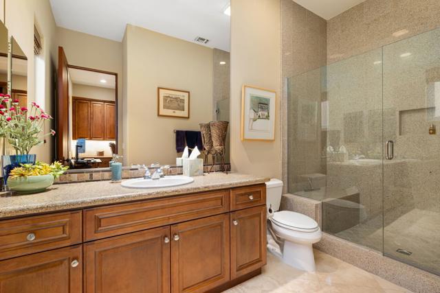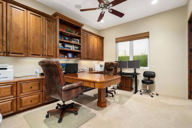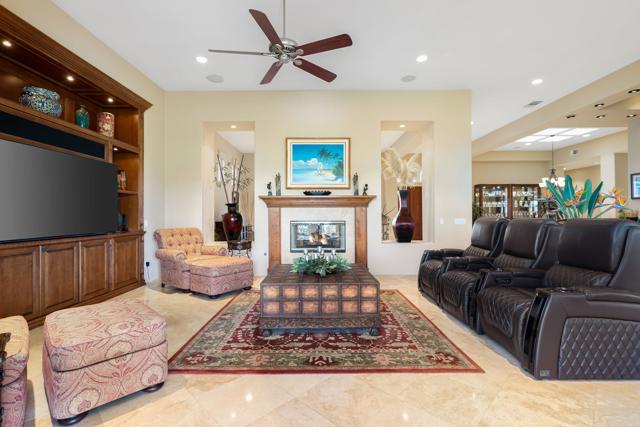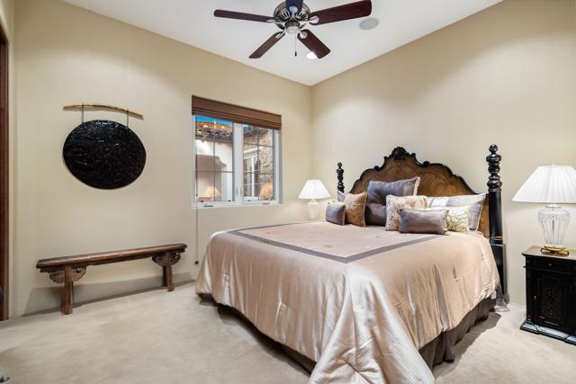 Welcome to 81802 Couples Court in the prestigious guard-gated Palms Country Club -- one of the desert's most exclusive and intimate golf communities. Positioned on a private dead-end cul-de-sac, this residence combines privacy, luxury, and sweeping golf course scenery. An oversized circular paver driveway provides an impressive arrival and reflects the care and quality throughout. The backyard delivers a true desert oasis with panoramic views of multiple fairways, sparkling lakes, and rows of iconic palms. Enjoy your private pool and spa enhanced by water features, dramatic fire bowls, and a highly desirable pool chiller that keeps the water comfortable year-round. The placement of the pool also maximizes privacy, creating a peaceful environment ideal for relaxation. Additional outdoor amenities include a beautifully built-in BBQ area conveniently located near the kitchen for effortless cookouts, along with a firepit lounge where you can unwind and take in amazing sunsets. Inside, the home features a well-designed floor plan accented by custom woodwork, rich built-ins, high ceilings, and quality finishes throughout. The interior was painted within the last three years, giving the home a fresh and current feel. The gourmet kitchen is equipped with Viking appliances, an ice maker, a reverse-osmosis system with a whole-home water softener, and thoughtful craftsmanship that elevates the entire space. The exterior was painted in 2024, offering a clean, modern appearance. A private guest casita--with its own separate living room--provides an ideal retreat for visitors seeking comfort and independence. Offered furnished per inventory, the home is ready for immediate enjoyment. The Palms Country Club is a gated boutique golf community known for its serene atmosphere, low-density design, and beautifully renovated clubhouse. This rare cul-de-sac location, combined with remarkable indoor-outdoor living and stunning golf course vistas, makes this a standout opportunity in La Quinta. This home has been pre-inspected, and a report is available to provide reassurance on the home's condition.