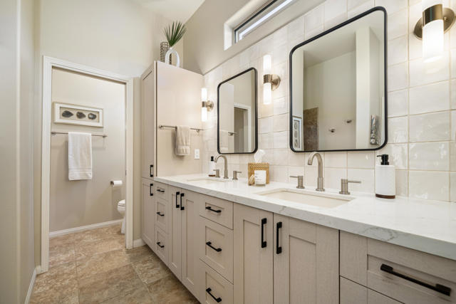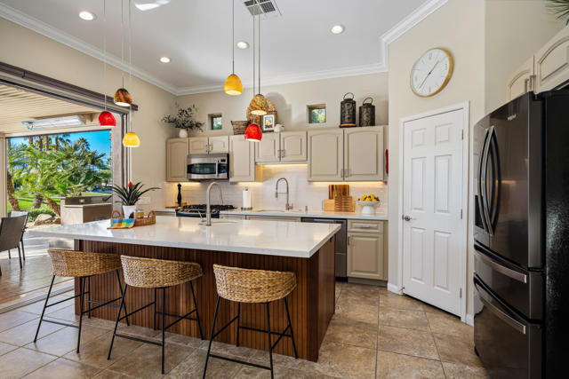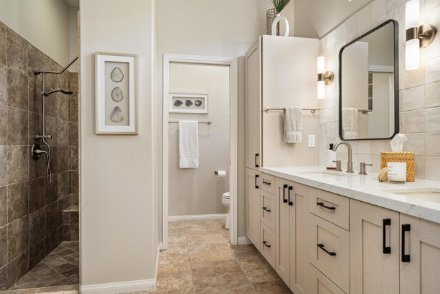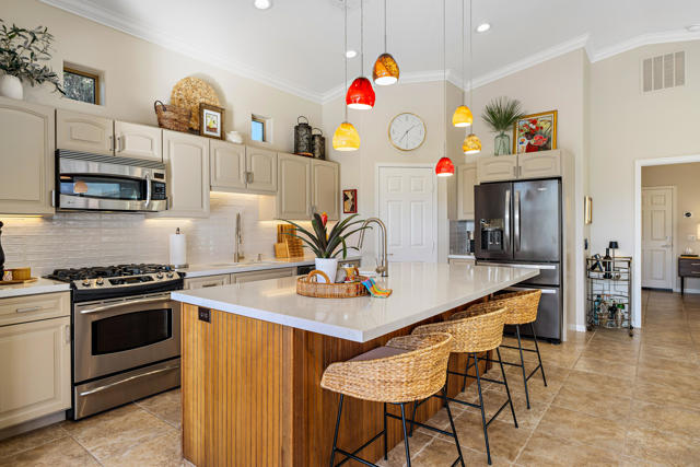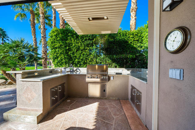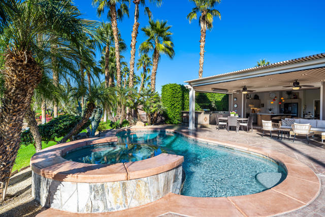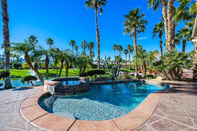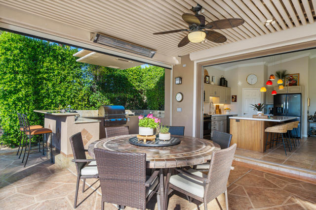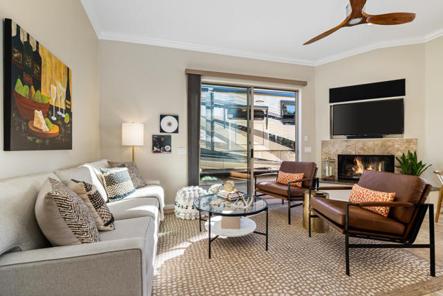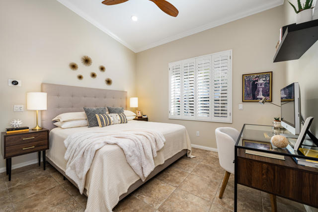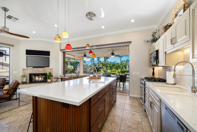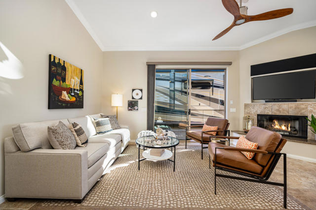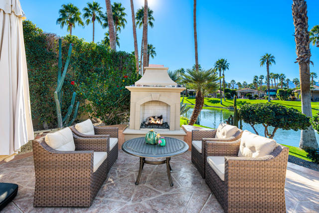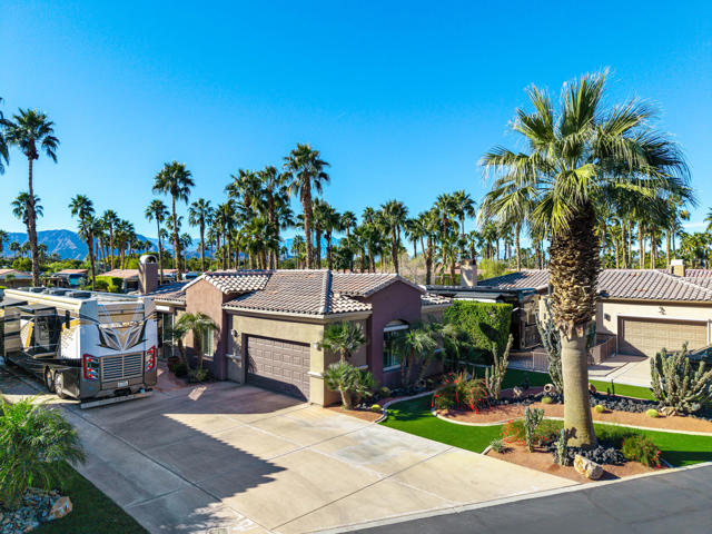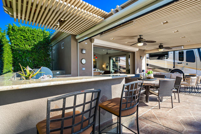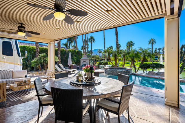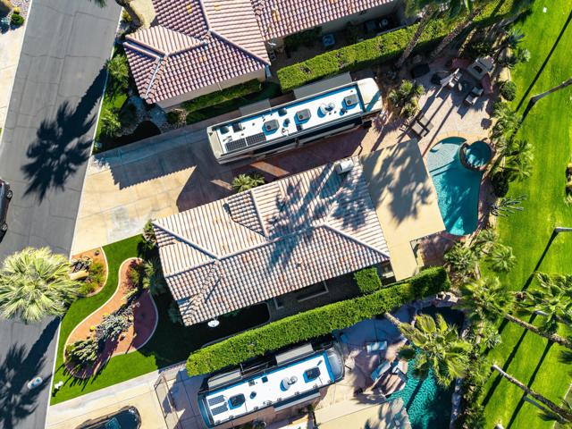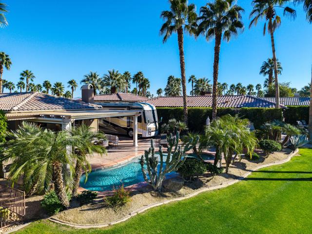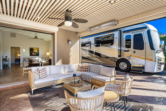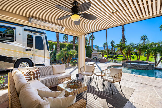 #85 DESERT SHORES MOTORCOACH RESORTDesigned for the discerning motorcoach lifestyle, this beautifully appointed villa offers an exceptional blend of comfort, sophistication, and indoor-outdoor living at Desert Shores Motorcoach Resort.Spanning approximately 1,200 square feet (845 living space/345 garage space) including a climate-controlled garage, the residence features an open and inviting great room that flows effortlessly into a well-designed kitchen with soft-tone cabinetry, quartzite countertops, stainless steel appliances, a single-level center island, and a walk-in pantry. Chiseled-edge porcelain flooring runs throughout the home, while a corner fireplace anchors the living space and creates a warm, elegant focal point.A standout feature is the dramatic three-panel sliding glass door system that stacks neatly behind the fireplace, allowing the home to open completely to the outdoors--delivering that seamless indoor-outdoor lifestyle prized by luxury coach owners. Electric shades provide privacy while still welcoming in abundant natural light.The private primary retreat is thoughtfully designed and includes a spacious en-suite bath with dual vanities, quartzite counters, decorative wall tile, and a generous walk-in shower. A large walk-in closet with custom organizers completes the suite, offering both functionality and refinement.Outdoors, the property truly shines. Situated on one of the deepest lots in the resort, the expansive lakeside patio offers an ideal setting for entertaining or relaxing against a backdrop of night-lit fountains and striking mountain views. A free-form pool with a raised quartzite spa, outdoor natural-gas fireplace, and a substantial covered patio--equipped with recessed lighting, built-in heaters, and electric sunshades on all three sides--make this a year-round outdoor living space.An outdoor barbecue bar with built-in grill, side burners, and granite seating further enhances the resort lifestyle, while newer low-maintenance turf keeps the front yard pristine with minimal upkeep.The oversized garage is equally well considered, featuring custom storage cabinetry, washer and dryer, split-system cooling, and a tankless water heater--ideal for full-time or seasonal motorcoach living.With a desirable western rear exposure, a prime Lake Two location, and offered furnished with select indoor and outdoor pieces, this property delivers the turnkey luxury and effortless outdoor-indoor rv living.