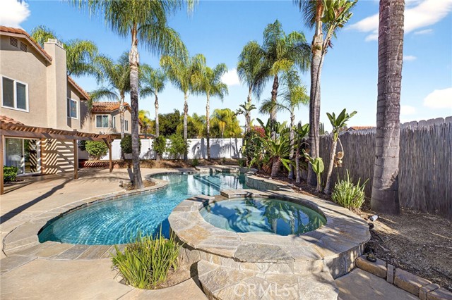 Experience the perfect blend of comfort and location in this charming 4-bedroom, 3-bathroom residence situated on a quiet cul-de-sac in the heart of Murrieta. Recently renovated and ready to move in, this home features a light-filled floor plan with soaring ceilings and a versatile layout. The main level offers a spacious living and dining area, along with a cozy family room centered by a classic fireplace. The kitchen provides ample cabinet space and overlooks the private, expansive backyard—ideal for outdoor entertaining complete with cover patio area - sparkling pool and spa. Upstairs, you’ll find the primary suite featuring high ceilings and an ensuite bath complete with dual sinks, large soaking bath and separate shower. Additionally, three well-proportioned bedrooms. Notable features include a 2-car attached garage, central A/C, and a tile roof. Located just minutes from top-rated Murrieta schools, local parks, shopping at California Oaks, and easy freeway access for commuters. Located within a short drive to the local wineries and the famous annual summer Temecula Balloon Festival and the beautiful Pechanga Resort Casino. This well-maintained home is a fantastic opportunity in an established neighborhood with no HOA. Don’t miss out on this Murrieta gem! Buyers, buyers agents to verify all information which is deemed reliable. Buyers-Buyers agents to verify schools. --