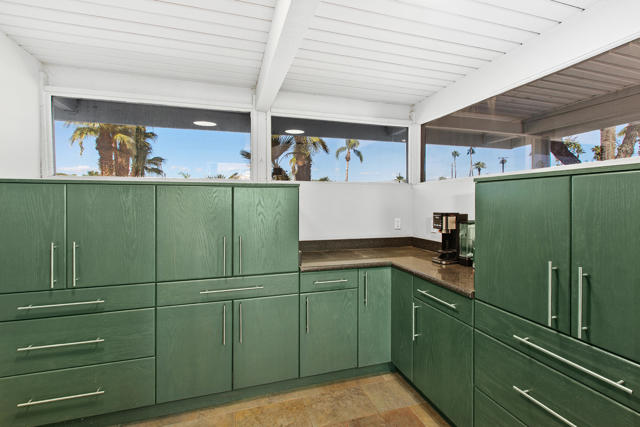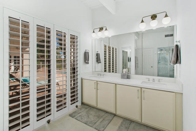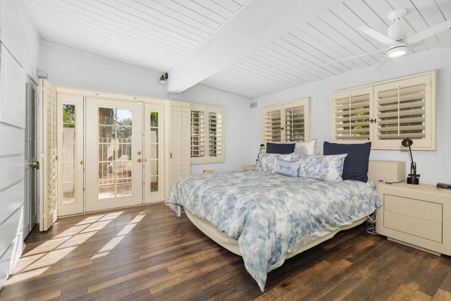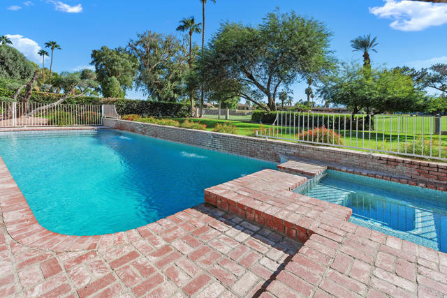 Your perfect seasonal escape awaits in this stunning mid-century modern home on the golf course at Bermuda Dunes Country Club. Built in 1960 and lovingly updated, it features 2 bedrooms plus office/den and 3 baths in the main home, plus a fully remodeled detached casita for visiting friends or family. Enter into this original model home in Bermuda Dunes CC and notice the high beam ceilings, and ''floor to ceiling'' glass across the entire living/dining room showcasing the Santa Rosa mountains and the #2 Fairway of Classic 1. The living room features a Stone fireplace for those cool winter nights. The kitchen has all the most updated S/S appliances featuring double ovens, two dishwashers for loadsof entertaining, wine refrigerator and a coffee bar and pantry area. Primary bedroom is spacious with door leading to the pool/spa. Ensuite bathroom has dual vanities and a large updated shower. The Ensuite guest bedroom is also spacious. The casita/guest house is amazing! With a King size murphy bed, kitchenette with induction cooktop, refrigerator & small dishwasher. New Flooring, Shower, Vanity and Toilet were also updated. Outdoors, you'll find a large grassy yard ideal for pets and playtime, a sparkling pool and spa, and breathtaking southern mountain and golf course views. Back patio has a Patio bar with a misting system across the entire back side of the house. Brand new foam roof was just installed. Two car garage has a 220 charger for your electric vehicle and epoxy coated floor. Golf Cart Garage recently added off of the pantry for those avid golfers. Designed for comfort and effortless living, this property offers resort-style relaxation, privacy, and a dog lover's back yard -- the ultimate Palm Springs area retreat.