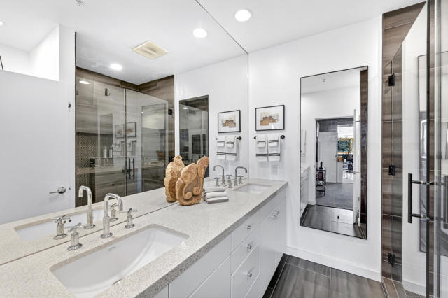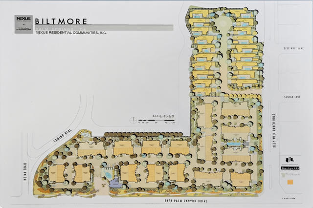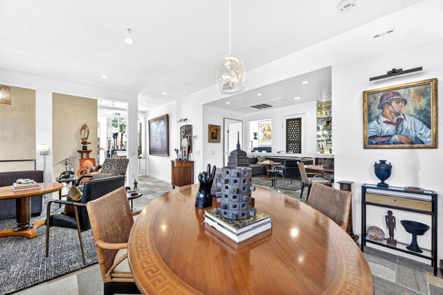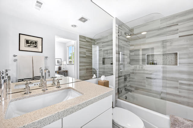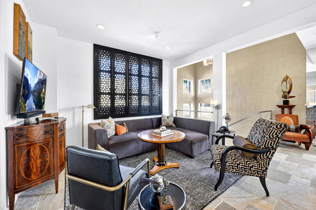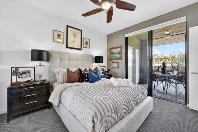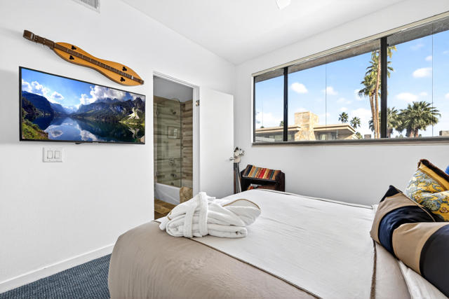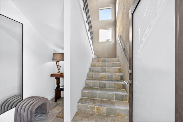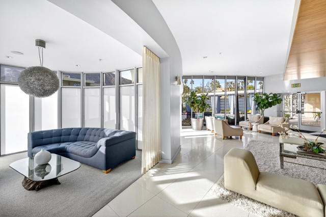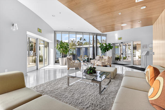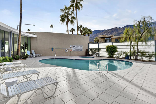 International Style best describes this exceptional tower residence at Biltmore Colony. Inspired by the iconic 1948 Palm Springs Biltmore Hotel by architects Frederic E. Monhoff and Henry L. Gogerty, the gated community reflects timeless resort elegance. This rare residence enjoys a prime interior location away from roadway noise and is uniquely positioned with no neighbors above or below, offering exceptional privacy. A dramatic two-story open entry sets the tone, featuring architectural concrete-finished walls that continue into the primary bedroom, creating a striking modern aesthetic. Natural stone flooring--matching the exterior cladding--flows throughout the main living areas, complemented by sleek stainless-steel railings and an abundance of windows that fill the home with natural light. The oversized, north-facing private balcony--finished in matching stone--functions as an additional living area and showcases spectacular mountain views, ideal for year-round enjoyment. Both bedrooms are thoughtfully appointed with custom built-in closet cabinetry and luxury carpeting, while the upgraded kitchen and bathrooms feature terrazzo composite slab countertops, adding modern sophistication and texture. Additional highlights include a full laundry room and a direct-access garage with extra storage. The residence is offered turnkey furnished, excluding items on the seller's exclusion list. Community amenities include multiple pools and spas, a design-forward clubhouse, fitness center, outdoor entertaining areas, and dog parks. Ideally located near Ace Hotel and Koffi, this is Palm Springs luxury living at its finest. You own the land.
