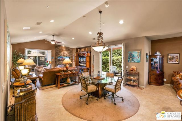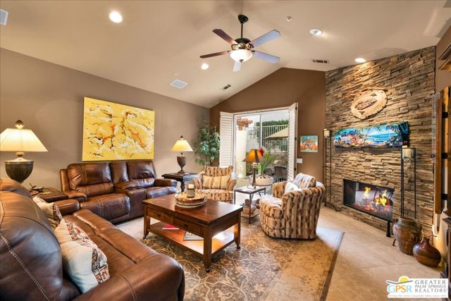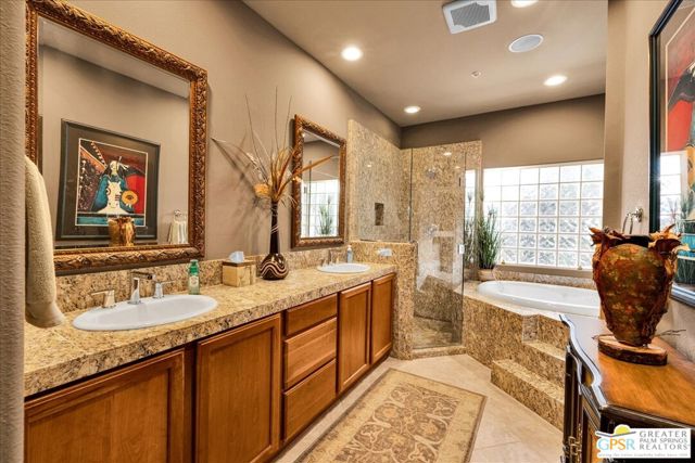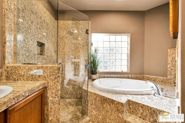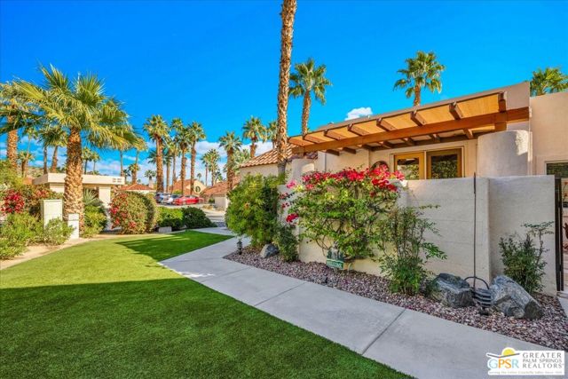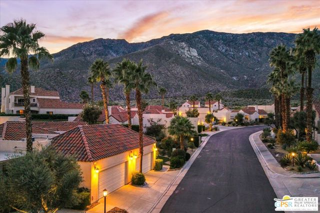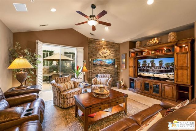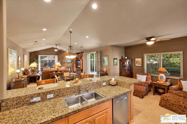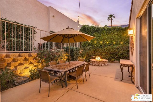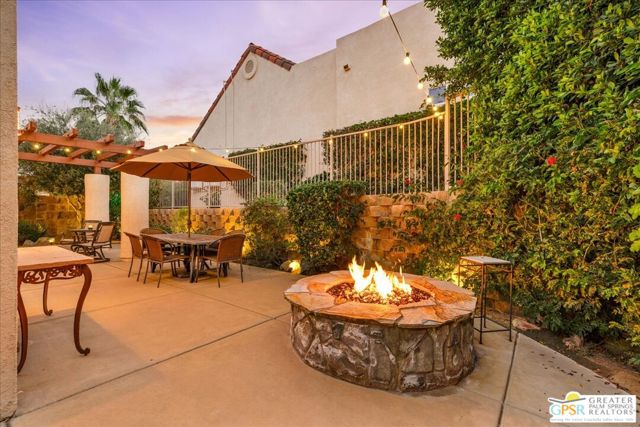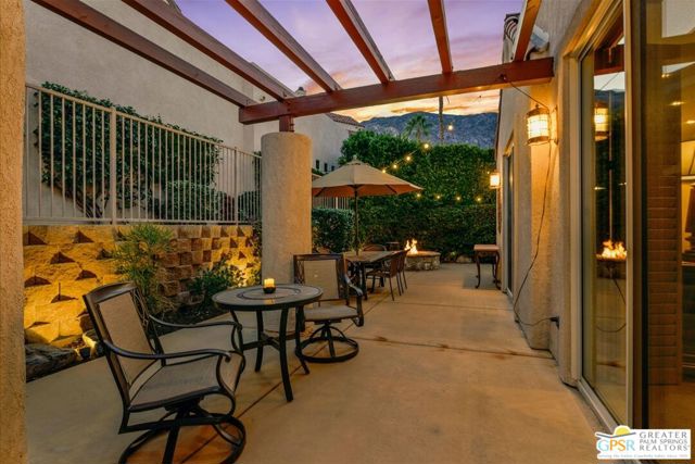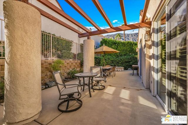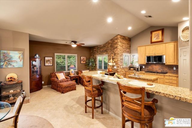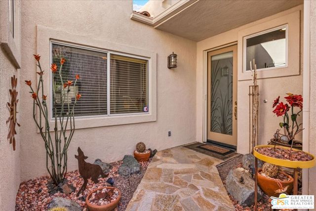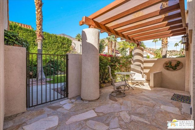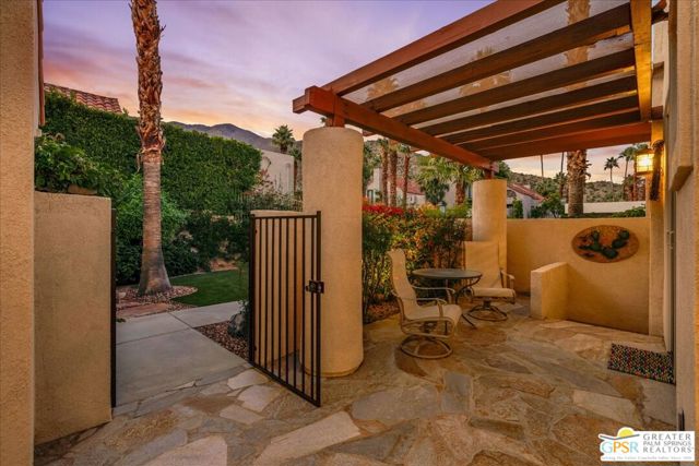 Elegant Hillside Living in Canyon Heights - South Palm Springs. Nestled within the desirable hillside enclave of Canyon Heights in quiet South Palm Springs, this expansive three-bedroom, three-bath residence offers a rare blend of privacy, natural beauty, and refined desert living. From the moment you arrive, LUSH LANDSCAPING and a generous stone-accented courtyard entry set the tone for a home that harmonizes seamlessly with its mountain surroundings. Inside, a neutral, nature-inspired palette highlights CUSTOM STONEWORK, stacked-stone accent walls, and 16-inch tile flooring throughout. Custom window treatments and thoughtful design details create a warm, inviting atmosphere that mirrors the beauty of the surrounding landscape. The recently updated kitchen anchors the home's ENTERTAINMENT WING and overlooks the great room. It features NATURAL GRANITE COUNTERTOPS, maple cabinetry with soft-close drawers, STAINLESS STEEL APPLIANCES including dual ovens, a prep island with sink, and a raised bar with ample seating. An adjacent breakfast or sitting area provides a peaceful space to enjoy views of the surrounding foliage. The open dining and living areas are filled with natural light and defined by VAULTED CEILINGS, a striking stacked-stone fireplace, and dual sliding glass doors that open to an expansive wraparound patio. Designed for true indoor-outdoor living, the patio offers generous space for entertaining, dining, and relaxing, and is beautifully landscaped with multiple seating areas and a LARGE-SCALE FIRE PIT - perfect for evenings under the desert sky. The primary suite is a private retreat, generously sized and thoughtfully designed with French door entrance, fireplace, a cozy reading nook, an entertainment niche, and glass sliding door with direct patio access. The spa-inspired ensuite bath features granite tile countertops, dual vanities, a glass-enclosed shower, a JETTED SOAKING TUB with fireplace, and a large custom-organized closet with mirrored doors. A second bedroom is located near the front of the home and includes a custom built-in desk and workstation with a Murphy bed, mirrored closet doors, and direct access to the secondary bath. The well-appointed secondary bathroom offers granite tile countertops and a beautifully finished stone tub and shower combination. Just off the main courtyard, a PRIVATE CASITA with its own ensuite bathroom adds exceptional flexibility - ideal as a guest suite, third bedroom, yoga studio, craft space, or office. Additional highlights include a finished two-car garage with epoxy-sealed floors and a whole-home PURE ELEMENTS WATER FILTRATION SYSTEM. Conveniently located just minutes from downtown Palm Springs, world-class dining, shopping, entertainment, and Palm Springs International Airport, this home offers both tranquility and accessibility. This Canyon Heights residence is a rare opportunity to enjoy spacious, sophisticated living in one of South Palm Springs' most coveted hillside communities.