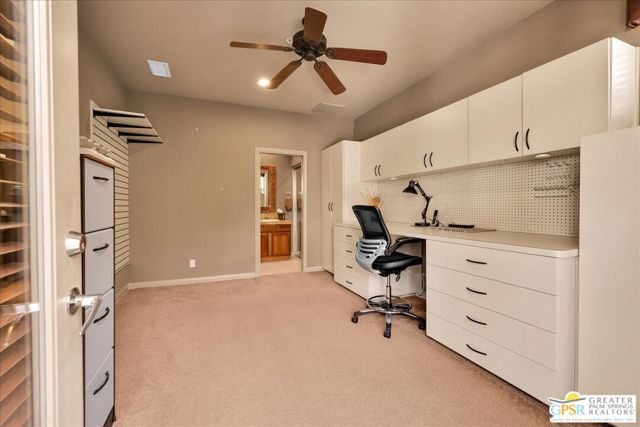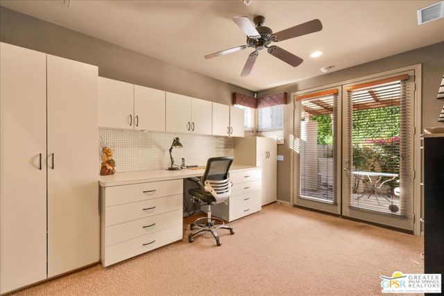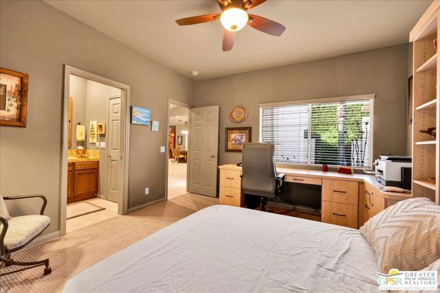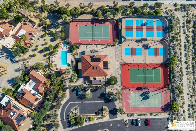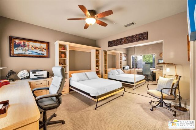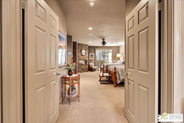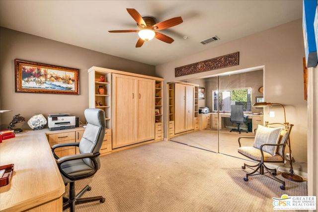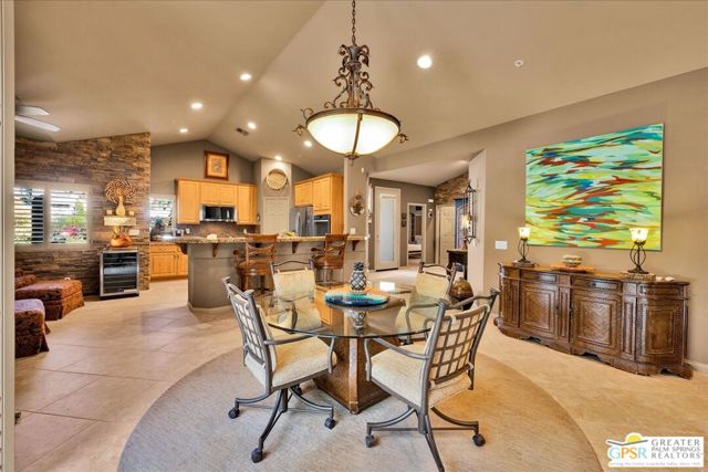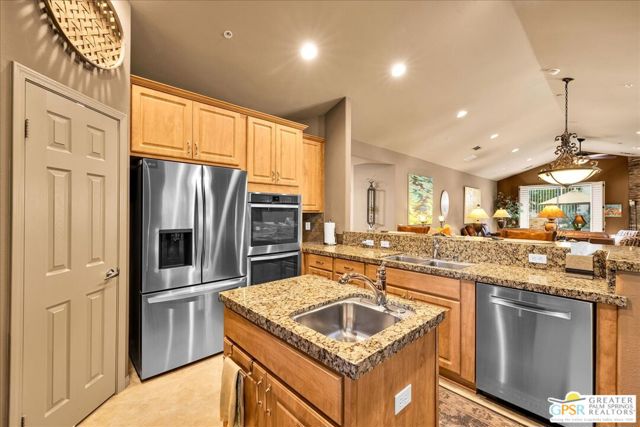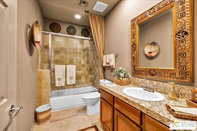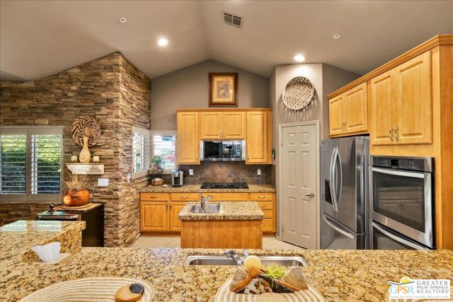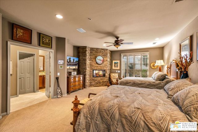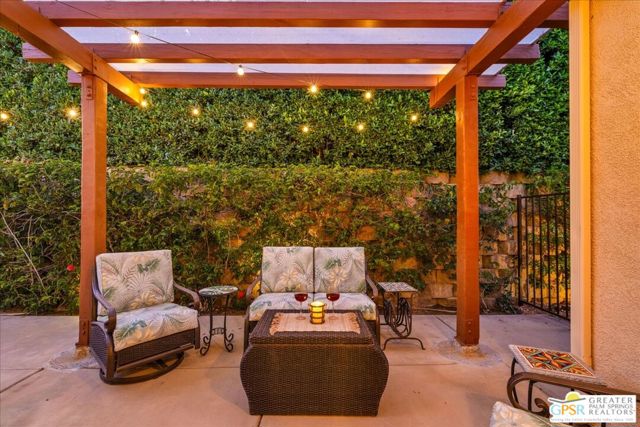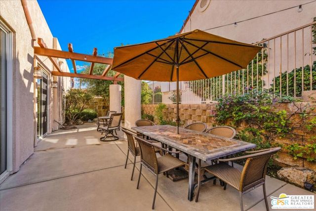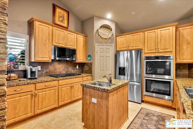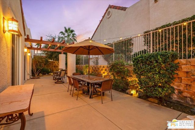 Elegant Hillside Living in Canyon Heights - South Palm Springs. Nestled within the desirable hillside enclave of Canyon Heights in quiet South Palm Springs, this expansive three-bedroom, three-bath residence offers a rare blend of privacy, natural beauty, and refined desert living. From the moment you arrive, LUSH LANDSCAPING and a generous stone-accented courtyard entry set the tone for a home that harmonizes seamlessly with its mountain surroundings. Inside, a neutral, nature-inspired palette highlights CUSTOM STONEWORK, stacked-stone accent walls, and 16-inch tile flooring throughout. Custom window treatments and thoughtful design details create a warm, inviting atmosphere that mirrors the beauty of the surrounding landscape. The recently updated kitchen anchors the home's ENTERTAINMENT WING and overlooks the great room. It features NATURAL GRANITE COUNTERTOPS, maple cabinetry with soft-close drawers, STAINLESS STEEL APPLIANCES including dual ovens, a prep island with sink, and a raised bar with ample seating. An adjacent breakfast or sitting area provides a peaceful space to enjoy views of the surrounding foliage. The open dining and living areas are filled with natural light and defined by VAULTED CEILINGS, a striking stacked-stone fireplace, and dual sliding glass doors that open to an expansive wraparound patio. Designed for true indoor-outdoor living, the patio offers generous space for entertaining, dining, and relaxing, and is beautifully landscaped with multiple seating areas and a LARGE-SCALE FIRE PIT - perfect for evenings under the desert sky. The primary suite is a private retreat, generously sized and thoughtfully designed with French door entrance, fireplace, a cozy reading nook, an entertainment niche, and glass sliding door with direct patio access. The spa-inspired ensuite bath features granite tile countertops, dual vanities, a glass-enclosed shower, a JETTED SOAKING TUB with fireplace, and a large custom-organized closet with mirrored doors. A second bedroom is located near the front of the home and includes a custom built-in desk and workstation with a Murphy bed, mirrored closet doors, and direct access to the secondary bath. The well-appointed secondary bathroom offers granite tile countertops and a beautifully finished stone tub and shower combination. Just off the main courtyard, a PRIVATE CASITA with its own ensuite bathroom adds exceptional flexibility - ideal as a guest suite, third bedroom, yoga studio, craft space, or office. Additional highlights include a finished two-car garage with epoxy-sealed floors and a whole-home PURE ELEMENTS WATER FILTRATION SYSTEM. Conveniently located just minutes from downtown Palm Springs, world-class dining, shopping, entertainment, and Palm Springs International Airport, this home offers both tranquility and accessibility. This Canyon Heights residence is a rare opportunity to enjoy spacious, sophisticated living in one of South Palm Springs' most coveted hillside communities.