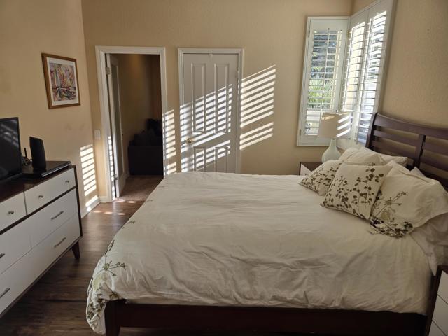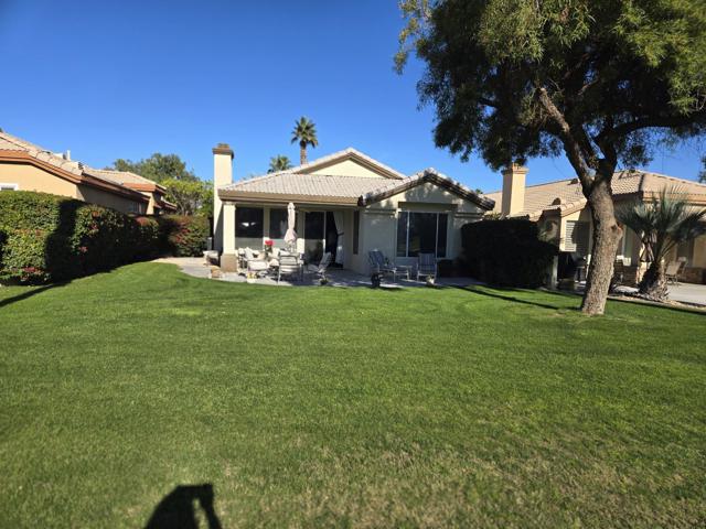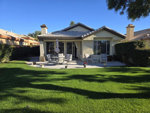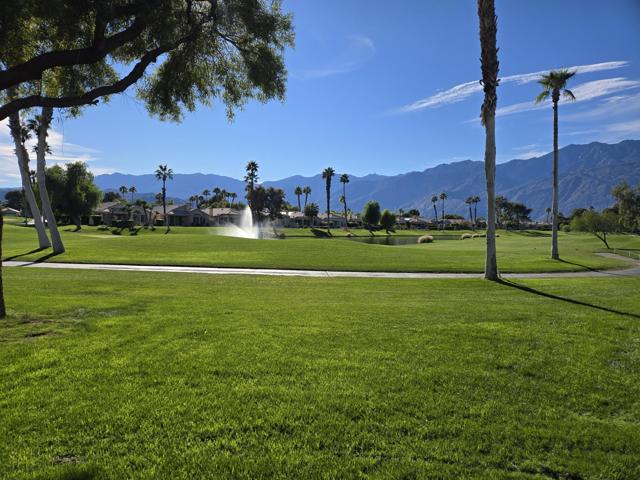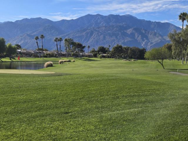YOU OWN THE LAND! Model Row Home! One of the best view locations at The Desert Princess. This Augusta floor plan, offers two master bedroom suites with ample walk-in closets, and bonus room. All Wood style laminate flooring. Stunning views of the fairway, green and water of the second hole of the Cielo golf course. Wide-open views of the majestic San Jacinto mountain range. Large patio, perfect for entertaining, barbecuing and sunning with the very popular south-western exposure. The kitchen has walk-in pantry and extra cabinets, has the feel of a Great Room and is perfect for social gatherings with its over-sized counter space and bar stool seating. HVAC replaced in 2020, Newer dishwasher, Maytag washer 2024, mister on patio. Outside of home painted in 2020. HOA dues include: 2 DVR or HD cable boxes and service, high-speed internet, grounds maintained to your door by HOA maintenance crews, outside pest control when requested, and outside water. Gated community with 24-hour guarded gate access and regular patrols for added safety and security, health and fitness center membership, tennis, bocce ball, and pickleball courts. Discounts and preferred tee-times for owners at the Desert Princess 27-hole PGA Championship golf course, no initiation fees, rated among the best in the valley by Golf Digest. Don't miss the opportunity to live in luxury with every modern comfort at your fingertips.