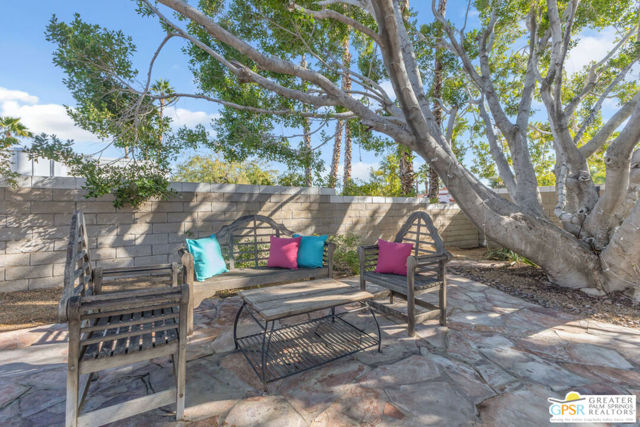 Set on a beautiful corner lot with panoramic mountain views, this serene retreat invites you to slow down and unwind. Enter through a private, walled modern courtyard that sets the tone for relaxed desert living. Inside, the light-filled living room features vaulted ceilings, a cozy fireplace, and elegant tiled floors, flowing seamlessly into the dining area and kitchen with custom stained concrete countertop and stainless steel appliances. Three sliding glass doors open to a spacious, ultra-private backyard featuring an oversized pool and raised spa, along with a covered patio and pergola ideal for lounging and entertaining. A magnificent ficus tree creates a lush canopy for a shaded seating area and comfortable outdoor relaxation while enjoying the stunning mountain backdrop. The primary bedroom and updated en-suite bath, featuring a granite counter, offer direct access to the pool, spa, and garden, while two guest bedrooms enjoy lovely west-facing mountain views. Additional features include an updated guest bathroom, Hunter Douglas window treatments, Low-E windows and doors, tankless water heater, water softener, and a two-car garage. Ideally located near shopping, parks, and downtown Palm Springs, this home is a tranquil desert escape designed for comfort, privacy, and effortless relaxation. Vista Norte is currently under the 20% cap on short-term rental permits, so this home could possibly be used as an income generating short-term rental property.