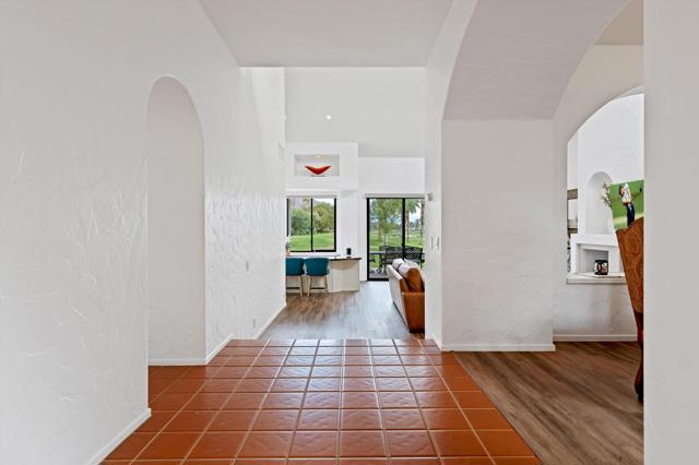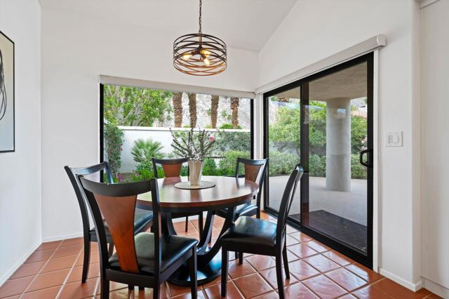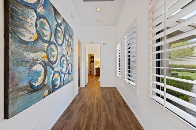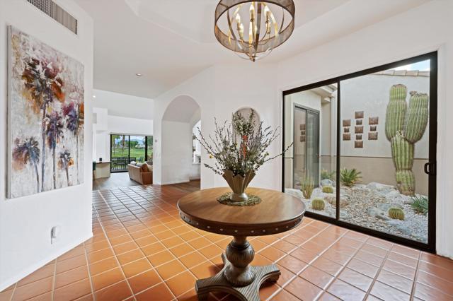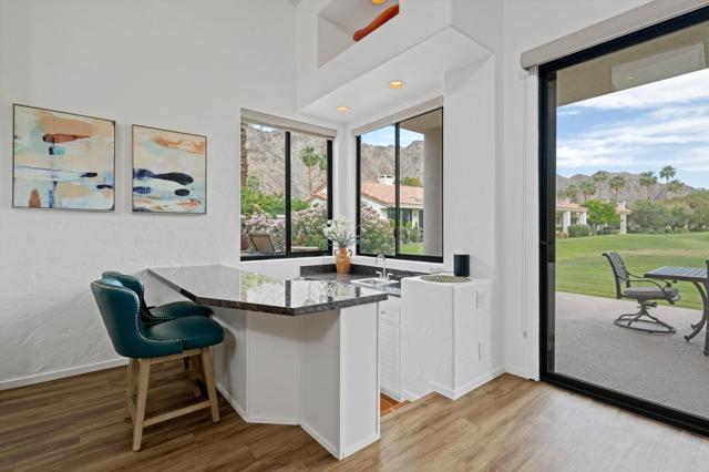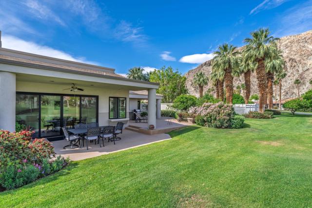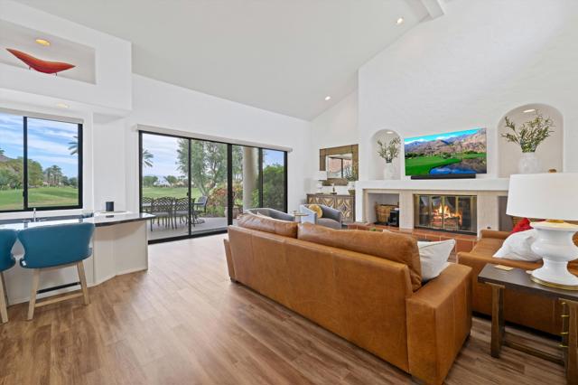 Nestled on the edge of #11 tee boxes of the Arnold Palmer private course with stunning mountain views, this pristine popular Legends 30, 3-bedroom, 4-bathroom home combines elegance, comfort, and convenience. Inside, you'll find a light-filled open floor plan featuring fresh paint, stylish vinyl plank flooring, and newer countertops that bring a modern touch to the kitchen and bathrooms. The kitchen also boasts all new Thermador appliances, perfect for everyday living or entertaining guests.Each of the three spacious bedrooms includes its own private bathroom, offering a sense of luxury and privacy throughout. Step outside on your over-sized patio to enjoy the peaceful golf course backdrop, or take a short stroll next door to the semi private pool and spa. Newer windows and patio doors, 2 newer hot water tanks, new split A/C in garage, newer garage doors, new bar fridge and more! Expansive side yard if you want to add a pool. This home is a rare opportunity to live in a beautifully updated space with unbeatable views and location. HOA includes all landscaping, internet, cable, security, trash, painting, roof and earthquake insurance. Come and see for yourself.