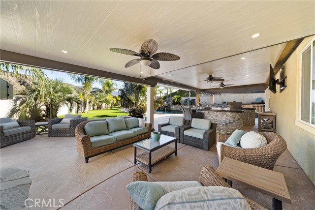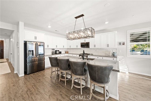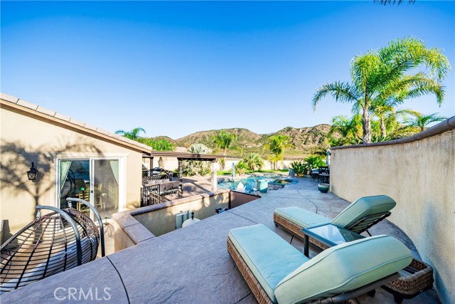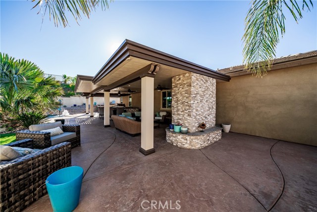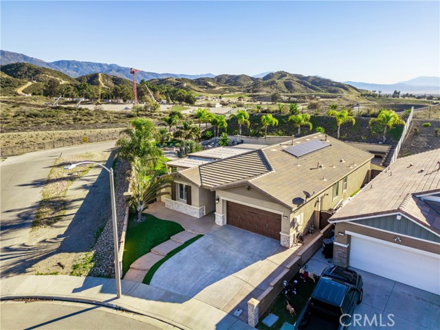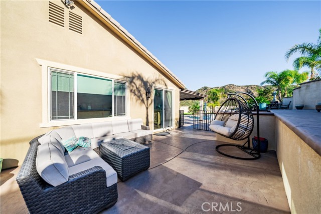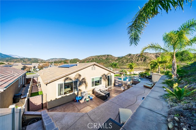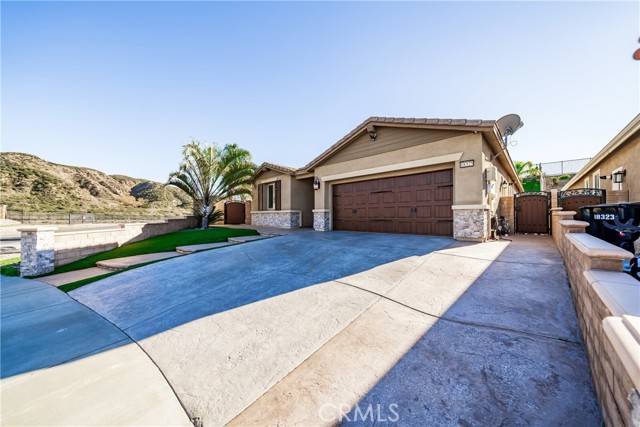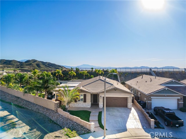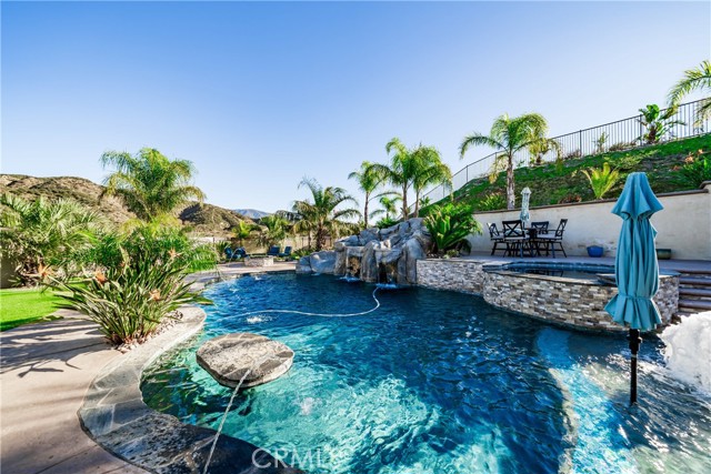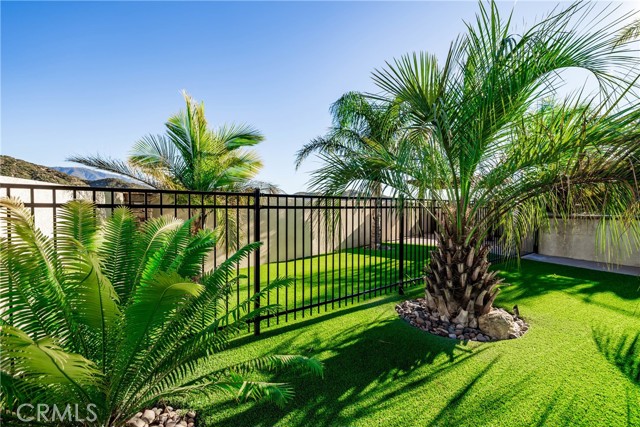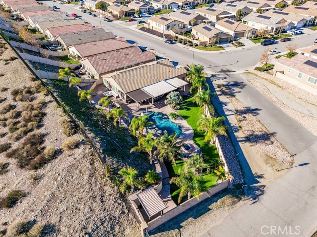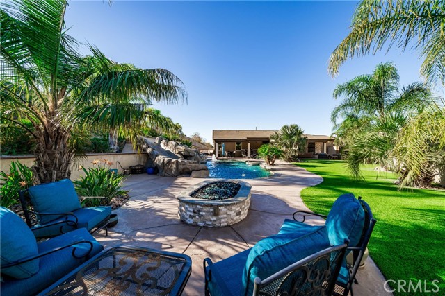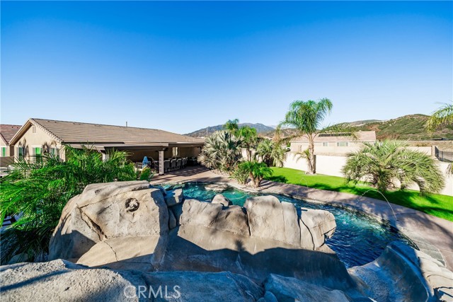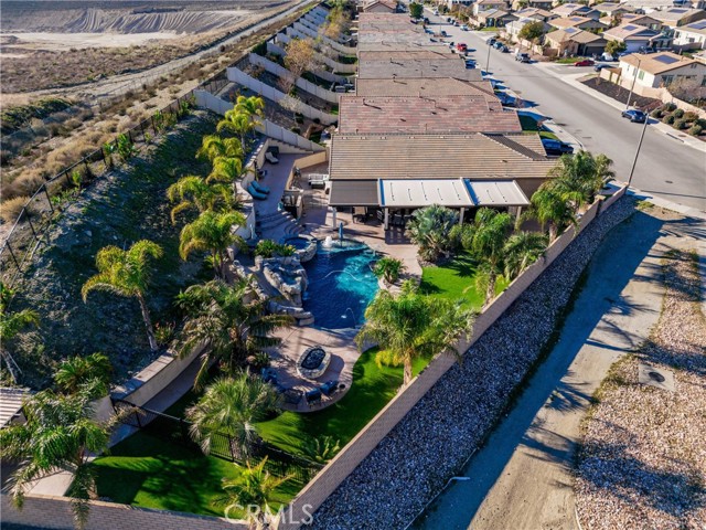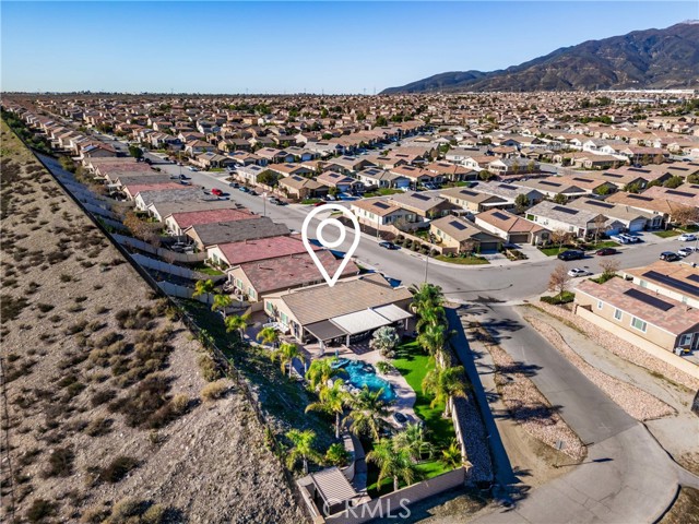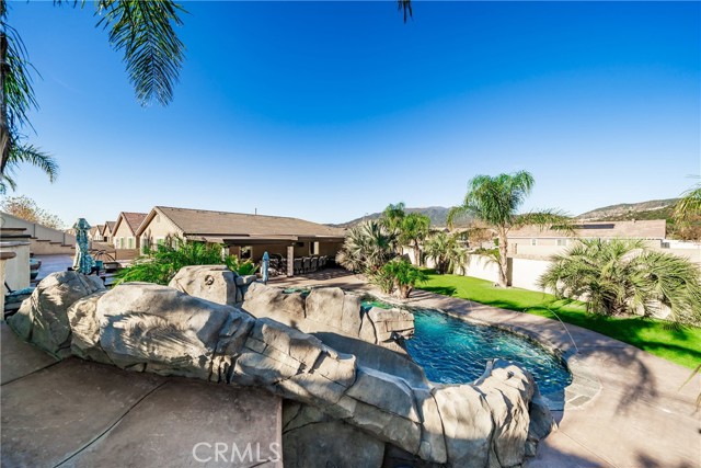 Welcome to 18325 Lapis Street, San Bernardino — a stunning 4-bedroom, 2-bathroom home designed for both everyday comfort and unforgettable entertaining. This property truly stands out with paid solar and an oversized resort-style backyard that feels like a private retreat. Step outside to your own entertainer’s paradise featuring a sparkling pool with waterfall, grotto, slide, and spa, surrounded by stamped concrete, lush turf, and over 20 palm trees accented with custom colored lighting. Host year-round gatherings in the expansive covered patio with ceiling fans, a stacked-stone outdoor kitchen, fireplace, firepit, and outdoor TV—perfect for relaxing or entertaining in style. Custom gates, stucco block walls, and thoughtful landscaping add privacy and curb appeal. Inside, the home is equally impressive with upgraded tile flooring, designer lighting, and an open, functional layout. The kitchen showcases upgraded appliances, stylish backsplash, and updated cabinet hardware, flowing seamlessly into the family room with custom built-in cabinetry. The primary suite offers upgraded carpet, a refreshed ensuite with upgraded finishes, and modern barn doors. Additional bedrooms feature upgraded carpet and custom window coverings throughout. Additional highlights include a stamped concrete driveway, upgraded garage door with added cabinetry, security cameras, upgraded front door with stacked-stone accents, and low-maintenance turf in both the front and backyard. This home is a rare opportunity to own a move-in-ready property that combines energy efficiency, luxury upgrades, and an unbeatable backyard—perfect for entertaining and everyday living.