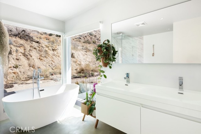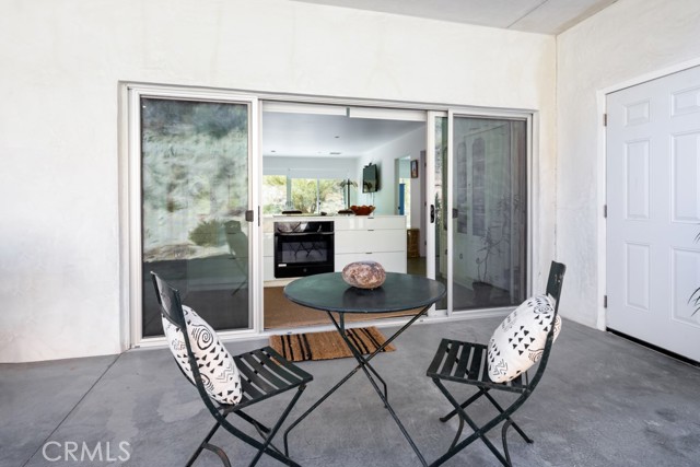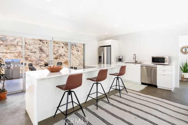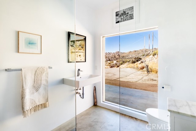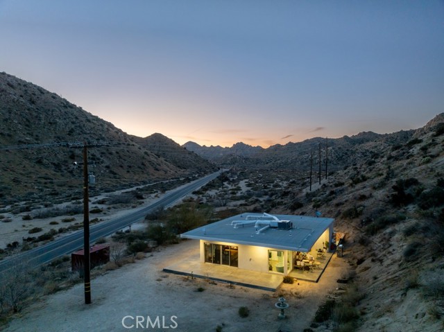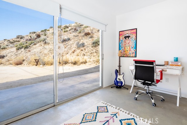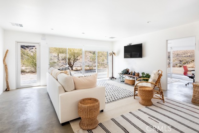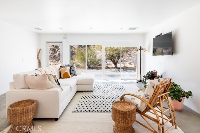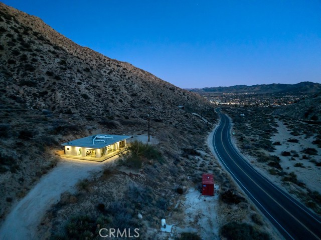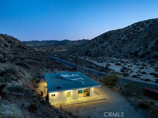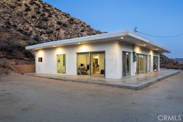 Gorgeous Mid-Century Home on 5 Acres With Phenomenal Location and Water Well! As you drive to this one-of-a-kind, 2 bedroom, 3 bathroom home, you're surrounded by breathtaking desert landscapes, boulder formations, and panoramic views. Pulling up the private driveway, you’ll immediately notice the chic modern architecture, perfectly positioned against a stunning mountain filled with cacti and other desert flora. Before entering, you are greeted by, unobstructed views overlooking the valley that stretch as far as the eye can see. Stepping through the front door, you will find a modern open floor plan with concrete flooring, recessed lighting, and an abundance of windows that bring in plenty of natural light, creating an open, airy feeling that flows throughout the home. Designed with entertaining in mind, the exquisite kitchen opens up to the rest of the living area, allowing you to prepare your favorite meals while still being part of the action. Equipped with counter seating, a stainless steel chef’s sink, quartz countertops, and all necessary appliances, it’s the perfect spot to prepare your culinary delights. The primary suite boasts gorgeous views of Yucca Valley, thanks to large, well-placed windows that maximize the stunning scenery. Enjoy direct access to the south patio through large sliding glass doors, showcasing indoor-outdoor living at its finest. The spacious primary bathroom features a gorgeous walk-in shower with dual rain showerheads, a modern vanity with dual sinks, and a soaking tub positioned to take advantage of the view! The guest bedroom and bath offer even more exquisite panoramic views of the majestic Sawtooth Mountains, above Pioneertown. Stepping back outside, you find the perfect spot to host barbecues and get-togethers or simply relax at the end of the day while taking in the phenomenal views. Enjoy bright blue skies above the vast valley during the day, and at night, watch the city lights twinkle against the backdrop of the Joshua Tree National Park. Bordering the property are 25 acres of protected UC and BLM land, allowing you to hike right from your front door into the untouched desert. Additional features include a private water well, HVAC for efficient heating and cooling, a separate laundry and storage room just off the back patio, and more! Minutes from boutique shopping, dining, and a short drive to the famous Pappy and Harriet’s, this property is hard to beat! Call to book your showing before this gem is gone!
