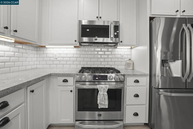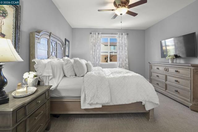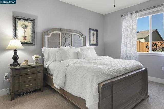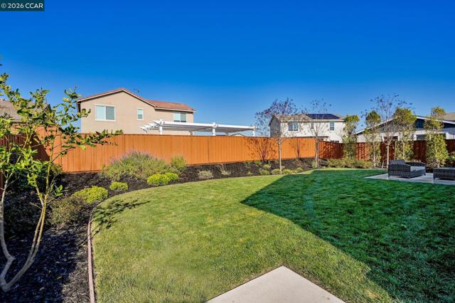 Single-story, solar-powered home on a .15-acre lot that shows like a model! Pride of ownership shines throughout this meticulously maintained home in the desirable Aviano community. The chef’s kitchen features quartz countertops, tile backsplash, designer cabinetry with LED lighting, LG stainless steel appliances, center island, pantry, and dining area—opening seamlessly to the spacious family room. Family Room has surround sound pre wiring for home theatre. The wide-open floor plan offers tall ceilings, recessed lighting, and ceiling fans throughout, with tile flooring and plush carpeted bedrooms. Enjoy the benefits of a buyer-owned 2.79-kW solar system with average monthly electric bills around $15, plus a tankless water heater and included LG washer and dryer. The spacious backyard includes a concrete patio, lush grass, and mature trees—perfect for relaxing or entertaining. Low HOA of $100/month. Residents enjoy over 25 acres of green space, parks, playgrounds, bocce ball courts, two dog parks, and walking and biking trails, with Miwok Meadows Park just blocks away. Conveniently located near Highway 4, BART, Antioch/Brentwood shopping including Costco, dining, and entertainment.