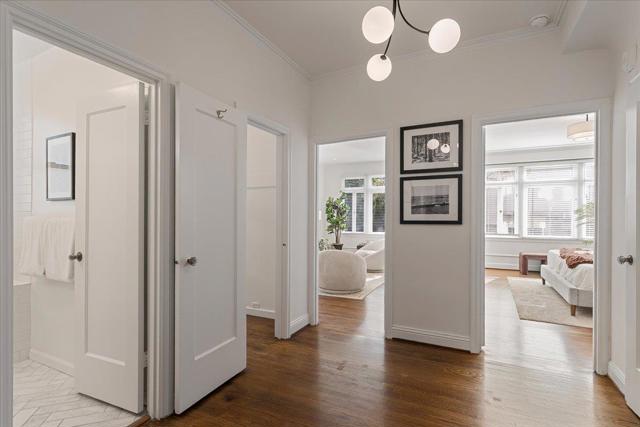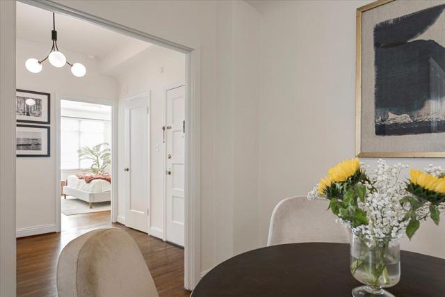 Prime location! Welcome to this classic 29-unit SF Edward elevator building. This corner & sunny 1st floor unit raised above street level feels like a single family home with recent updates & nestled in the vibrant city right next to the Union St. This residence features 10 feet high ceilings with bay window & lots of windows. Hardwood flooring throughout. Updated kitchen has brand new quartz countertops & tile backsplash, white cabinets with new knobs, new stainless appliances, gas oven range with new microwave. Freshly painted, new light fixtures. The kitchen seamlessly integrates with the living space, creating an inviting and practical layout. Updated bathroom is adorned with marble and tiles features a combined shower and tub for your convenience. The spacious bedroom and living room include two large walk-in closets, contributing to ample storage options or an office. The property offers community laundry facilities and breathtaking roof deck offering 360 views of the GG Bridge, Alcatraz, Coit Tower and downtown. Just a short walk to Moscone Park, Fort Mason, Marina Green, and a block from the amenities and public transportation on Union Street. Very easy access to the building and to this unit located on the 1st floor without many stairs. Walk Score 98, Walker's Paradise!