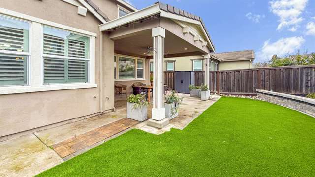 Situated at the end of a quiet court and just steps from scenic trails, this meticulously maintained 4 bedroom, 3 bath home with a spacious loft offers refined living in the highly sought after River Islands community of Lathrop. Spanning just over 2,200 square feet, the open floor plan blends elegance and functionality and is ideal for both everyday living and entertaining. Pride of ownership is evident throughout, featuring a freshly painted exterior, brand new carpet and padding, reverse osmosis water filtration, EV charger prewire, tankless water heater, built in fire sprinkler system, and an extensive pantry offering exceptional storage. The low maintenance yard has been professionally upgraded with custom paving and premium turf, creating a clean and modern outdoor retreat. A permitted patio enclosure just under 325 square feet extends the living space and provides seamless indoor outdoor living, perfect for year round enjoyment. Located within the award winning River Islands master planned community, residents enjoy a premier lifestyle just minutes away from trails, lakes, parks, and top rated schools. This home offers luxury, privacy, and convenience in one of the Central Valley’s most desirable communities.