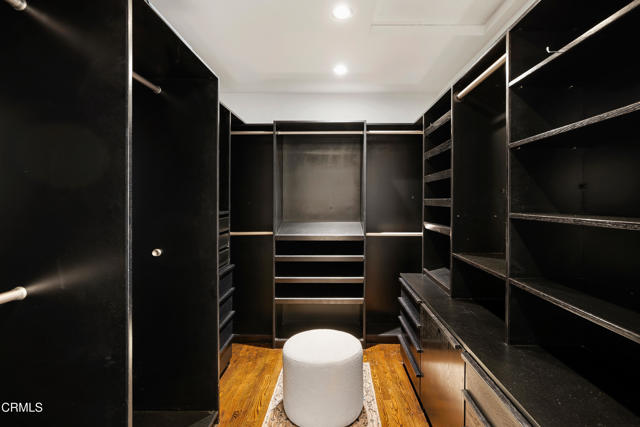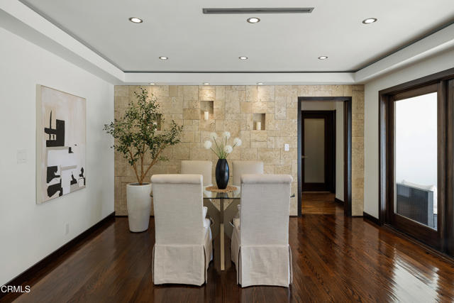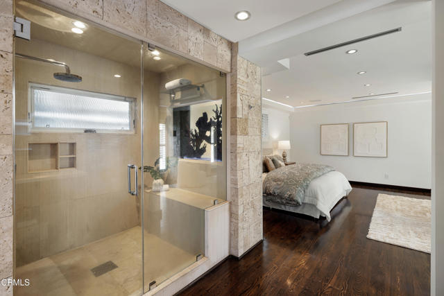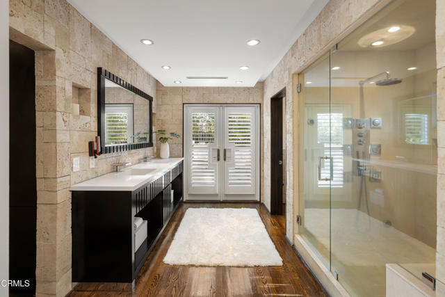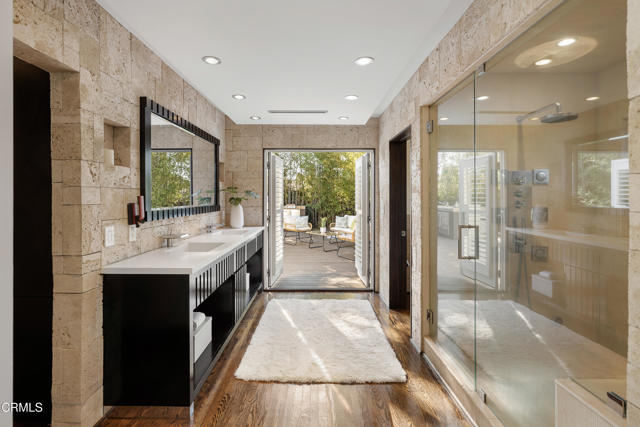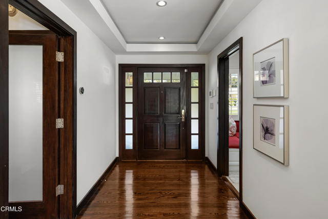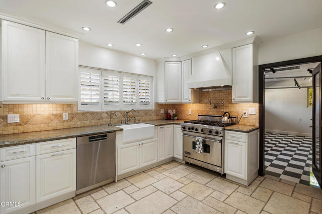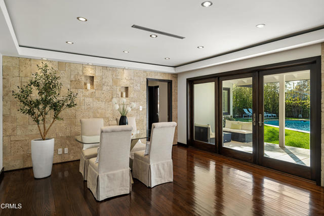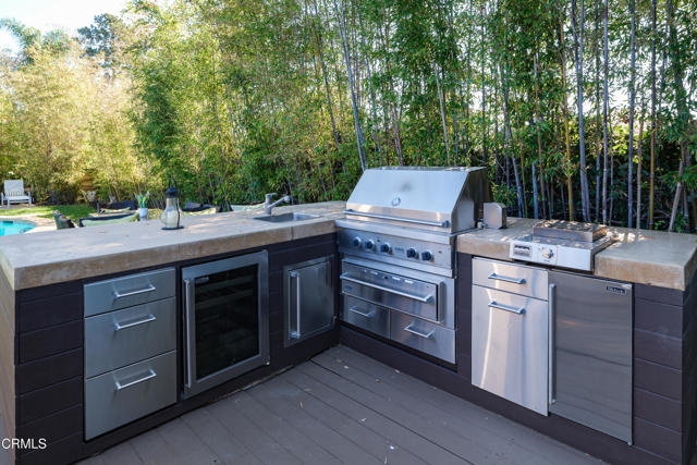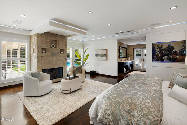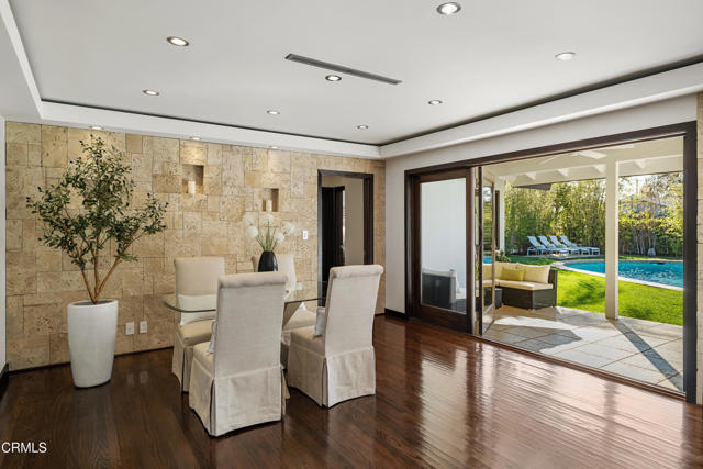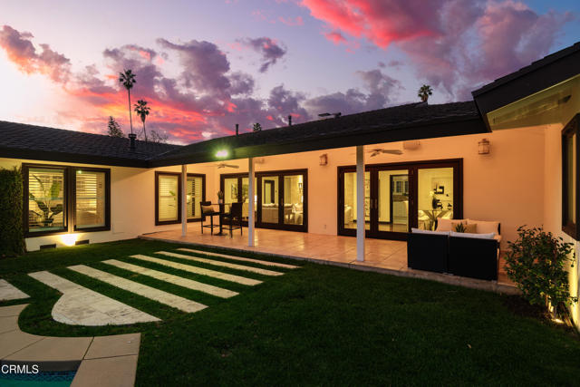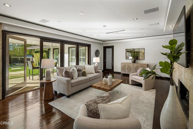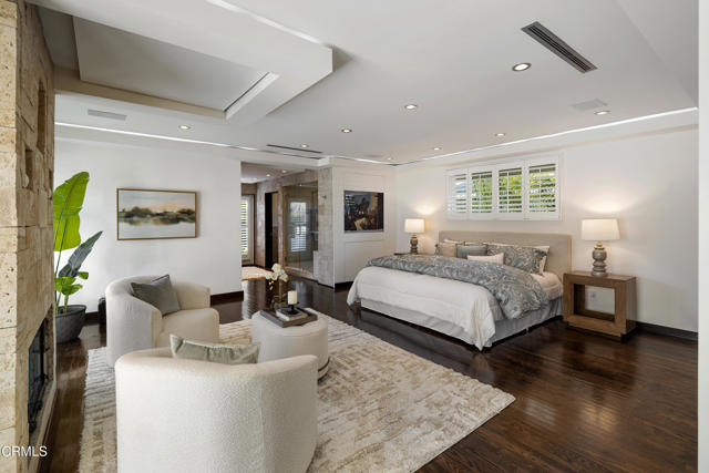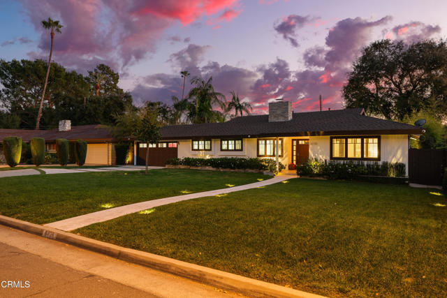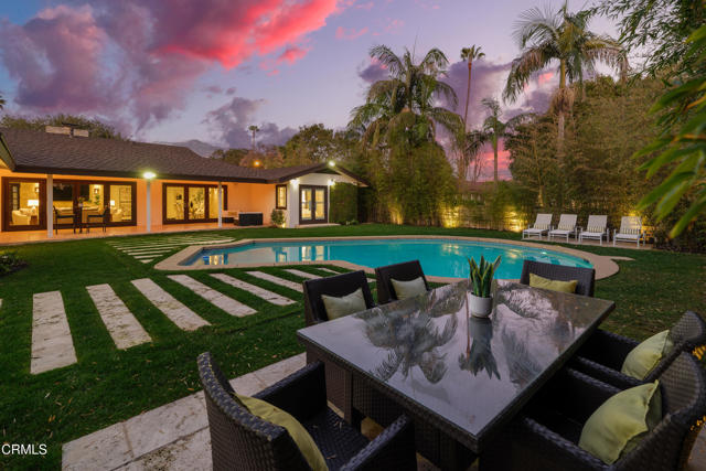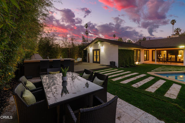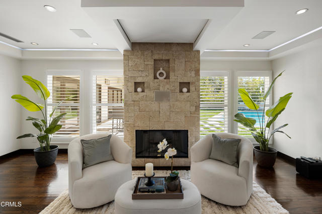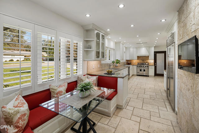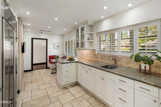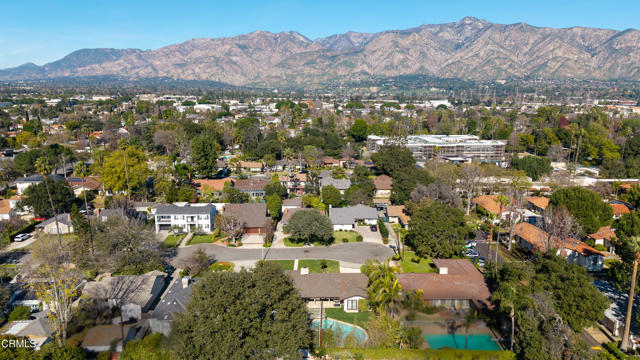 Set at the end of a beautifully manicured cul-de-sac, this reimagined luxury ranch estate delivers a rare blend of refined elegance & resort-caliber entertaining. Every detail has been thoughtfully curated. A professionally landscaped approach & stone pathway lead to a covered porch & into an interior defined by gleaming hardwood floors, Lumintron-controlled lighting & designer finishes throughout. The heart of the home is a statement kitchen where culinary artistry & social gatherings come together. Tile flooring, stone countertops & a dramatic tiled backsplash frame an exceptional suite of appliances, including a Viking Professional 6-burner range, a Sub-Zero refrigerator & freezer. A seamless transition from the kitchen leads to the fully finished garage with cabinetry & a laundry area. Living & dining areas unfold in an open, sophisticated flow accented by custom crown molding with integrated uplighting. A wall of floor-to-ceiling windows & French doors dissolves the boundary between indoors & out, opening to a backyard designed as a private luxury retreat. At its center, a custom-designed pool with integrated lighting & water features complemented by an in-deck spa. A fully equipped outdoor kitchen has a Viking gas grill, warming drawer, beverage refrigerator & gas burner cooktop, making entertaining under the stars easy. An outdoor shower & bamboo privacy hedges complete this secluded oasis. Within the home, private bedroom suites offer flexibility & comfort. One suite enjoys French doors opening to the backyard & a spa-style bath featuring a rain shower & 6 body jets. Two additional bedrooms are connected by a beautifully appointed Jack-and-Jill bath with a dual-sink vanity & a jetted soaking tub with a rain shower & body jets. The primary suite stands as a true sanctuary, expansive & indulgent in scale. There's a fireplace with a stone surround, a hidden dropdown TV & picture windows framing backyard views. The suite's spa-inspired bath is luxurious, highlighted by an in-wall saltwater aquarium, a shower with bench seating, a rain shower & multiple body jets. Dual vanities, a private water closet & direct access to the outdoor deck & spa elevate the experience even more. A walk-in closet with built-ins completes the suite. This exceptional Pasadena residence is designed for those who entertain without compromise, where sophisticated interiors, resort-style outdoor living & meticulous craftsmanship converge in a setting of rare privacy & prestige.