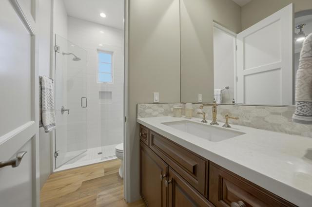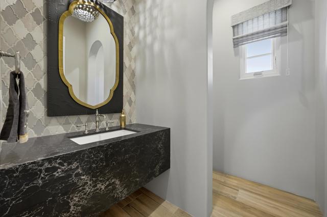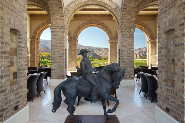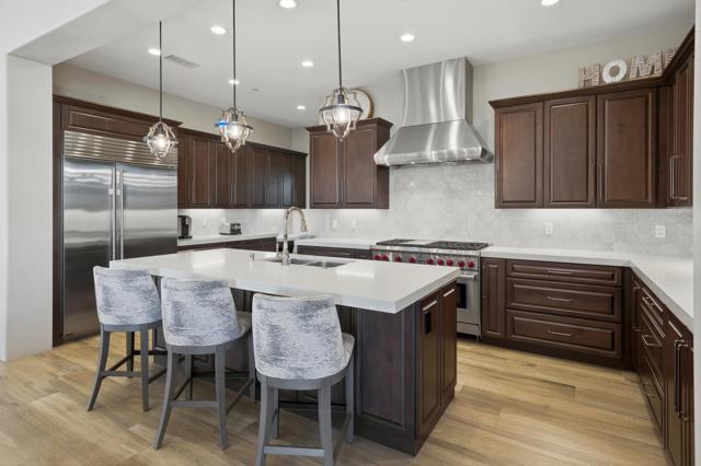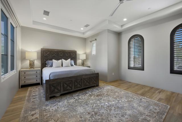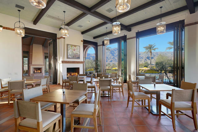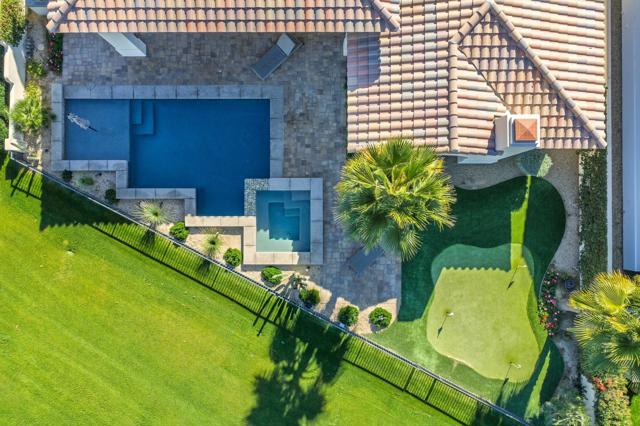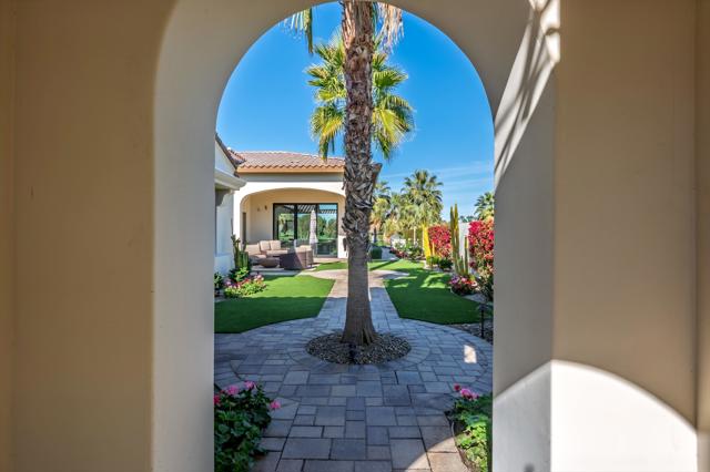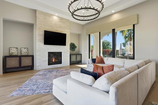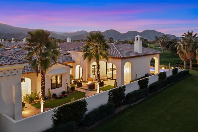 Set on a coveted end lot bordered by a lush greenbelt, this exceptional residence offers remarkable privacy and sweeping desert beauty from nearly every angle. Thoughtfully positioned to capture lake views, the 5th green, and the 6th fairway of the Rees Jones designed course. The home is further framed by dramatic vistas of the Santa Rosa and Coral Mountains, visible from both the courtyard and the backyard. The outdoor living spaces are truly special. A private courtyard welcomes you with a cozy fire pit that is perfect for evenings under the stars while the backyard is designed for both relaxation and play, featuring a personal putting green and serene golf course views that stretch into the distance. The expansive open space creates a quiet backdrop, reinforcing the home's relaxed, resort-style atmosphere. Inside, the 4-bed, 5-bath home is designer furnished, blending comfort with refined style. Wood-look ceramic tile flooring runs throughout the main living areas, adding warmth and continuity to the interior spaces. The great room is anchored by a striking stacked-stone fireplace, creating a natural focal point and an inviting atmosphere for entertaining or quiet nights in. Every detail has been curated to complement the home's surroundings, allowing the outdoor views to take center stage while maintaining a sophisticated, modern feel inside. This is a rare opportunity to own a private, view-oriented retreat where indoor and outdoor living come together seamlessly. Come live the life you've always imagined.